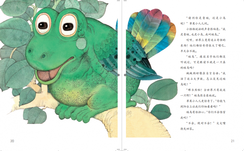 ![]() 《苹果小人儿奇遇记》这个故事的来源是,有一天他的一个学生带着自己的女儿来看金老师,那个小姑娘给金老师画了一幅画,她说我画的是一个苹果小人儿,鼻子眼睛嘴巴都有,脸上还有几个雀斑,金老师问为什么还有雀斑,小姑娘说因为张雀斑的小姑娘勇敢。这就是苹果小人儿的最初原型,一个小女孩的奇思妙想,可爱而有趣的形象。在金波老师的笔下,赋予了精彩的故事情节,感觉非同凡响,又是一个孩子向往的童话故事。 苹果小人儿和她的好朋友尖尖嘴、绒绒狗,来到了小怪物蛙鸟的家——怪怪林。这里到处都是奇妙的景象:河里的小鱼会爬上岸,小鹿的头上长着小树,树上长满了面包和香肠。有趣的故事人物和好玩的故事情节,写实中充满梦幻,奇特中又有着理所当然,处处透着团结友爱、坚强勇敢的成长动力。这是金波老师带给孩子的正能量,我们很喜欢这类题材的童话故事。 本书总共是7000字,一共8个故事,特别很适合小学阶段的孩子们。这8个小故事为:玎玎画了一个苹果小人儿,苹果小人儿很丑吗,看见一个小怪物,一个奇怪的地方,苹果小人儿放起了没线的风筝,绒绒飞上了天,天上的搏斗,再见吧苹果小人儿。故事里一个有趣的“小怪物”——青蛙鸟,一个萌萌的小怪物,有着青蛙的身体,小鸟的翅膀。充分表达了孩子天马行空的奇思妙想,和苹果小人儿的好朋友尖尖嘴、绒绒狗,一起体验怪怪林的奇妙世界,这是一场有趣而美好的探险之旅。 ![]() ![]() 这是小女孩的家,苹果小人儿诞生的地方。看,苹果小人儿和好朋友尖尖嘴、绒绒狗在一起玩耍,感觉特别和谐。 ![]() 这就是怪怪林,一个神秘的地方。蛙鸟和苹果小人儿、尖尖嘴、绒绒狗,在阳台上愉快地聊着天。 ![]() 他就是我们的蛙鸟,有着青蛙的身体,小鸟的翅膀,稀有动物啊! ![]() 童话世界的一切都是奇妙的,陪伴着孩子们慢慢成长,读着金波老师的作品,传递正能量,感觉很美好,相信每个孩子都会喜欢。 本作品未经作者许可不得转载,转载请征求作者意见。擅自转载使用,将保留追究其法律责任的权利! 评分记录