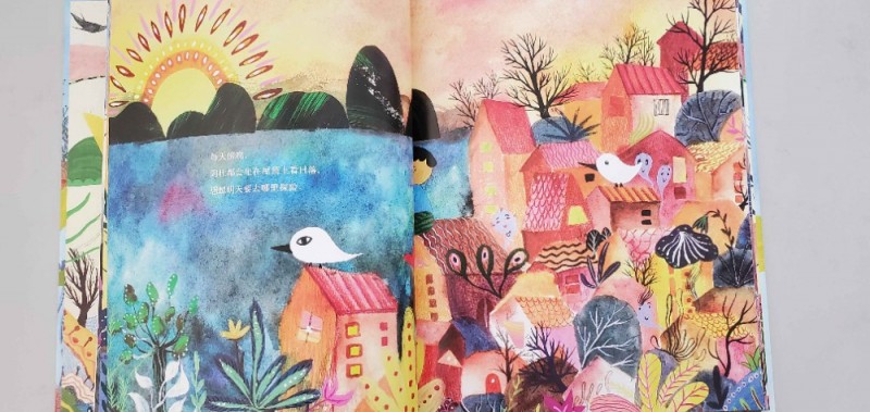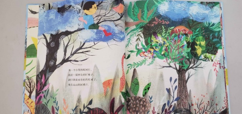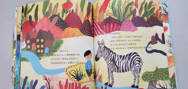 今天试读的书是一本非常漂亮又有内涵的书。收到这本书的快递的时候都有点迷茫。因为快递包装很大。这本书被保护的非常好编辑老师真的是很用心了。 这本书的作者和绘画是同一个人,名字叫邢志伟。听说是一个非常年轻的作者。从插图上看也是充满了童趣。有点像小朋友们自己画的画。颜色非常的鲜艳线条也非常的分明。蓝蓝的天空绿绿的树木。各种形态各异的动物植物呈现在孩子们面前。有点抽象派但是符合孩子的认知,阅读起来会更有融入感更容易接受吧。 红袜子在我们中国是有着很好的寓意的。一般本命年的人会在春节的时候穿红袜子带红腰带。首先红色看着就是特别喜庆的颜色其次有辟邪走鸿运得含义。我想作者起这个名字也是有着美好愿望的。 故事中的小男孩叫阿壮,肯定是个壮壮实实的小朋友。穿着蓝色上衣绿色的短裤,最醒目的就是这双神奇的红色袜子了。他喜欢穿着红色袜子坐在高高的树梢上,这双红色袜子给了阿壮神奇的力量。这副夕阳下的景色真的是太美了,就像孔雀开屏一样漂亮,房顶上好像长了海草一样。这幅画真的是让人脑洞大开啊。穿着红袜子阿壮总是可以找到回家的路,不怕远也不怕黑。每天都想着第二天要去那里探险。有一天阿壮突然发现自己的红袜子不见了,他上山下海的到处找,但是总也找不到。后来他问了森林里最聪明的动物斑马。斑马告诉他:“红袜子消失了,是因为他已经不需要了。“没有红袜子阿壮依然可以想去自己想去的任何地方。 我们父母就是孩子的红袜子。随着孩子年龄和阅历的增长他们慢慢就不在依赖我们了。往往这个时候父母还会有点失落吧。所以在孩子小的时候我们要多多陪伴孩子。除了陪伴还要培养孩子应对各种问题的能力。孩子们都是特别期待自己快快长大的。我们大人倒是希望时间能在慢一点。最近打算跟老二分床睡呢。我跟孩子说好他睡着我在走。我发现孩子真的好像是无所谓的,晚上虽然一开始总是说睡不着但是拍了拍也就很快入睡了。反倒是我总是特别舍不得离开。我晚上又留在孩子旁边睡的。早晨睡醒孩子看到我还挺纳闷的呢。我说我昨天不小心睡着了。