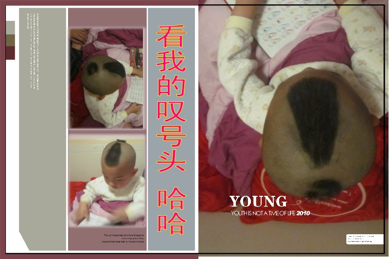 哈哈,一个大大的感叹号出现在了航的脑袋上,嘻嘻,航的旋很正,所以这个大大的叹号我认为理得还是比较满意的,哈哈,第二天上学走在路上,那回头率是百分子百呀,谁见了都说,呀这孩子头型真造呀,真酷,哈哈,大家看酷不酷啊!