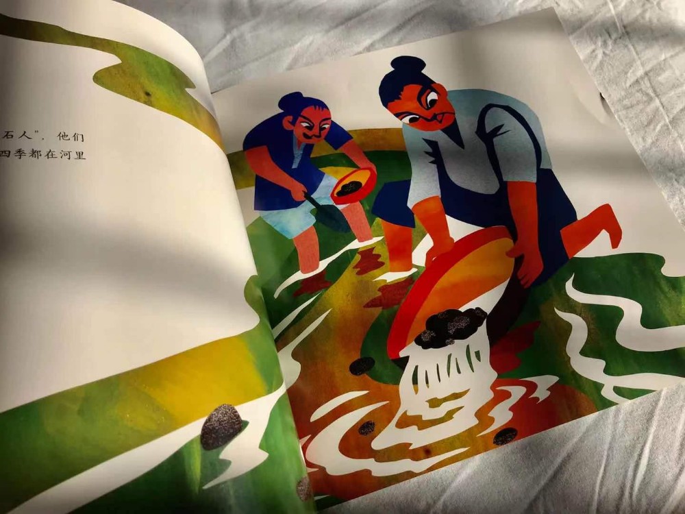 《了不起的自然传说》延续了《山海经》《搜神记》等古典神话传说和民间故事风格,立足于奇幻的故事,探讨生命的永恒意义,歌颂坚强、快乐、努力、不屈不挠的精神。 而《墨石娃娃》封面四字,就像从墨里走出来般,手指摸上去略略有凹凸感,适合带着孩子让他感知这种触感。下面是一双大手捧着戴花环的墨石娃娃,非常讨人喜爱。手和脚还带着爪子。两边河水里的墨石,好似都能闻到墨滴的气息。 一打开书,古人田园生活的气息,记忆里的《葫芦娃》动画片,都一一浮现脑海中。属于自己国土的气息感瞬间上来,很是喜欢。 故事里的人们,一开始以淘洗墨石,庆祝一阵子,然后再高价卖给他人。人们也邀请技艺高超的工匠,将墨石雕刻成小娃娃,看上去大概三五岁的样子。他们一个个活生生、胖嘟嘟、水灵灵的。形态特别可爱。剪纸的画面活灵活现。 更神奇的是,墨石娃娃可以发出声音,他们像真的娃娃那样牙牙学语,再过一段时间可以跟人进行简单的交流。人们特别宠爱墨石娃娃,把他们当成亲生子女一样对待。 墨石娃娃有几种类型,最喜欢的就是头顶能绽放七彩花朵的墨石娃娃,美丽极了。像凤凰。没想到这些墨石娃娃掉进水里变成了鱼,一直朝大海游去。少年在后面追,这一段可有趣了,孩子非常非常喜欢。 没想到进入了宽敞明亮的水域,五颜六色的水草交织在一起,仿佛一座宫殿。他们在这里遇见了他们的母亲和兄弟姐妹,与他们久别重逢。原来,墨石是黑鱼,黑鱼是有家的,也有母亲和兄弟姐妹。 少年悄悄离开这里,回到了村子,把见到的情形告诉了乡亲们。乡亲们深受感动,都把家里的墨石娃娃放入河中。墨石娃娃变成无数黑鱼游走了。河面上一片璀璨的荧光,像是流动的银河。洗石人纷纷改行了,墨玉娃娃成了永远的传说。 这个故事真是太棒了,让孩子学会尊重生命,它们也是有家有亲人的生命,应该生活在属于它们的环境里。
