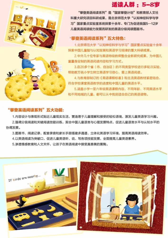 Frank the rat 大老鼠弗兰克 Frank the rat is in a bag. 大老鼠弗兰克在袋子里。 Frank is in a hat. 弗兰克在圆顶帽子里。 Frank is in a pan. 弗兰克在平底锅里。 Frank is on a bat. 弗兰克在球棒上。 "Oh,no!"Frank is on a cat. “哦,不!”弗兰克落在了猫身上! B: The Biscuits 饼干 "I'm hungry!" “我饿了!” A biscuit… 一块饼干…… A biscuit can be a bus. 一块饼干可以是公共汽车。 A biscuit can be a bick. 可以是自行车。 A biscuit can be a boat. 可以是船。 A biscuit can be a banana. 可以是香蕉。 A biscuit can be a bear. 可以是小熊。 A biscuit can be a butterfly. 可以是蝴蝶。 But…if birds are nearby… 但是……如果鸟儿靠近…… The biscuits can only be birds. 饼干只能是小鸟啦。 (这是一个妈妈和宝宝做做饼干,鸟儿饿了,然后飞来,把饼干啃成了鸟的形状的故事。) C: Cool Cat 酷猫卡里 Cary is a cool cat。 卡里是只酷酷的小猫。 cary can cut carrots like this. 卡里能像这样切胡萝卜。 Cary can climb a coconut tree like this. 卡里能像这样爬树。 Cary can clean a crocodile like this. 卡里能像这样清洁鳄鱼。 Cary can catch files like this. 卡里能像这样抓苍蝇。 Can Cary color like this? 卡里能像这样涂色吗? Yes! 是的 Cary is a cool cat. 卡里是只酷酷的小猫。 D: Dancing Dad 爸爸爱跳舞 Dad loves dancing! 爸爸爱跳舞! Dadis dancing with the desk. 他和桌子一起跳。 Dad is dancing with the duck. 他和鸭子一起跳。 Dad is dancing with the door. 他和门一起跳。 Dad is dancing with the dog. 他和小狗一起跳。 Dad is dancing with the deer. 他和小鹿一起跳。 Where is dad? 爸爸在哪儿? Wow! 哇! What a dancing dad! 真是个爱跳舞的爸爸。 |