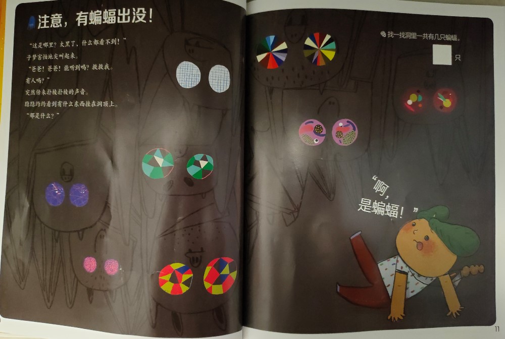 ![]() 是不是听到“洞穴探险”有种要开始探险之旅的感觉呢?没错这的确是一本探险书,我们要跟寻一位叫做子梦的小朋友开始洞穴之旅。这本书结合阅读、思考、动手为一体,非常有趣是一本非常不错的亲字互动书。我和我家小朋友一口气读了三遍呢! 故事的开始要从子梦捡球开始,到了盼望已久的周末,子梦和爸爸一起去山上野营。到达山顶后,一望无际的大海展现在他们的眼前。子梦和爸爸在一起玩球,,球滚到了很远的地方,子梦去捡球,确一不小心掉进了洞里,黑黑的洞里有好多蝙蝠他们有着奇特的大眼睛,只有数出洞里有几只蝙蝠才能帮子梦顺利过关。 ![]() 子梦每到一个地方都要求小朋友通过不同的题目帮子梦过关。影子消失了,图画中有很多影子,要求小朋友们帮子梦找到他的影子;如何走出弯弯曲曲的路,需要小朋友用标签纸标出正确得道路;来到香甜美味的糖果洞穴,子梦的舌头变成了和糖果一样的颜色,找一找子梦吃的是哪一款糖果;世界上最大的阶梯需要小朋友帮助子梦把梯子贴在巨大的台阶之间;还有彩虹滑梯、会滴水的神奇石头等等不同的主题。 《空间思维培养游戏书—洞穴探险》里每一个故事都是一个不同的主题,每一个主题都非常的有趣,参与性非常的强,这本书通过集贴纸、选择、判断、迷宫、拼图等多种方式来调动孩子们的参与积极性,它是一套专为儿童打造的空间思维训练游戏绘本,让孩子“立起来”思考。 这套书共3册,《热带探险》《北极探险》《洞穴探险》分别展示向读者展示了黄沙漫漫的非洲热带风格及有趣的热带探险活动,寒冷的北极地区的冰上探险,掉进漆黑山洞的洞穴探险,在惊险、刺激的活动中融入了思维训练游戏,好玩儿有趣,又能锻炼孩子的空间思维意识。 这套书既可以用来亲子阅读,儿童也可以自主阅读。教给孩子们在不同情境下如何运用观察力、思考力和判断力培养幼儿的全方位思维能力。在不知不觉中提高专注度、拓展想象力、增强自信心,给孩子们带来前所未有的精彩体验,在情境认知中让幼儿获得成就感。 ![]() ![]()