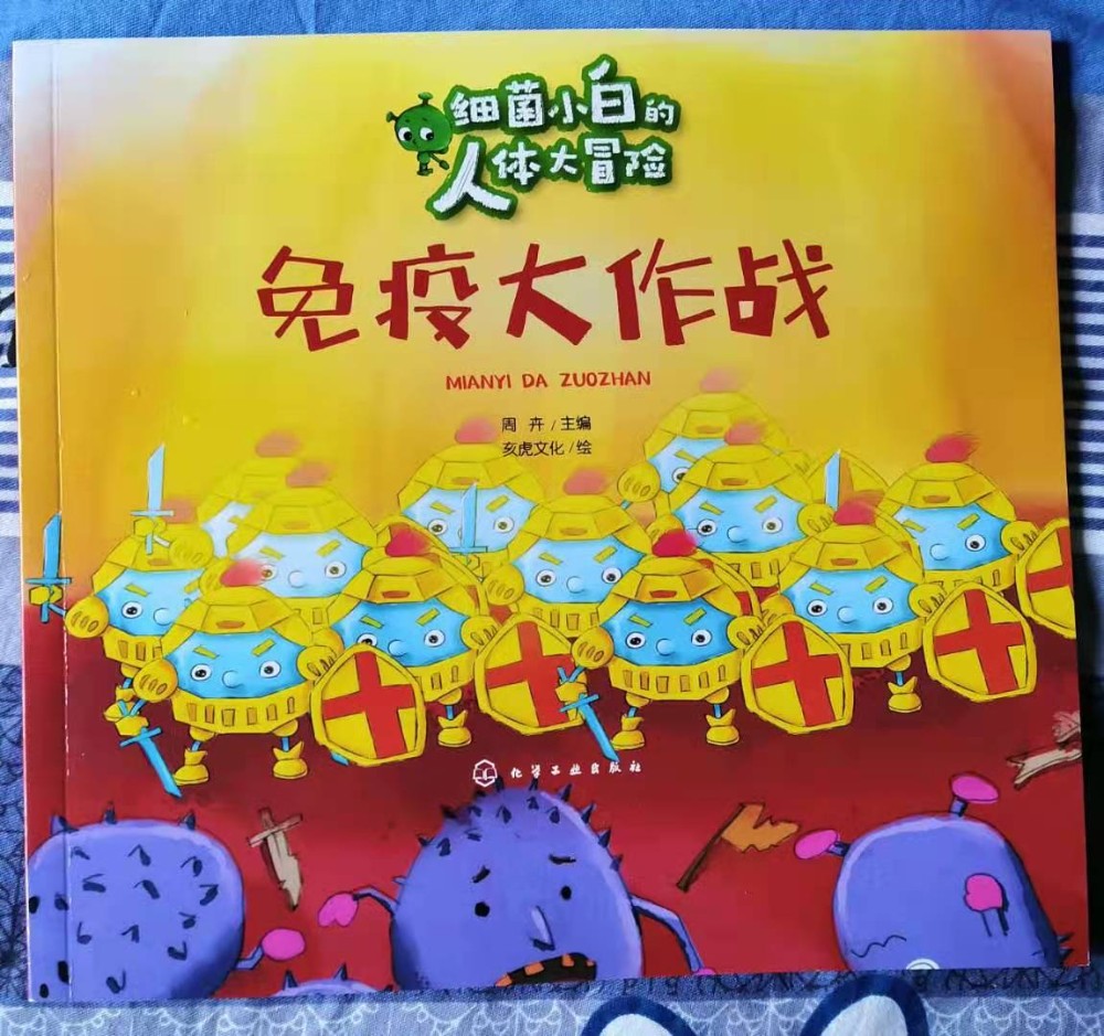 书 名 :《细菌小白的人体大冒险》 品 牌 名 :化学工业出版社 人体是一个复杂庞大的系统,口腔、消化、免疫、神经、水循环等系统每天都在忙碌的工作着。稍不注意,或者生活中养成了一些坏习惯,这些系统的工作就会被打乱,让身体不适甚至生病。绘本《细菌小白的人体大冒险》以故事的形式告诉孩子们人体生理常识和工作原理,帮助孩子们养成好的生活习惯,健康茁壮成长。 《细菌小白的人体大冒险之免疫大作战》通过细菌小白在“免疫城堡”的所见所闻,给孩子科普人体的免疫系统,告诉小朋友们要注意个人卫生,远离病菌。 这是一个非常有趣、引人入胜、很有教育意义的故事。 细菌小白在皮皮的身体里东南西北地乱走,忽然眼前黑影一闪,一个大家伙挡在面前!这是病菌士兵!原来,小白来到了病菌的地盘! 病菌士兵押着小白来到了病菌营地,见到了死光光大将军!死光光大将军认定小白是免疫城堡派来的奸细,要他交待进入免疫城堡的路。可小白根本不知道免疫城堡在哪里!于是,小白被关进了列光光军营的大牢里。 死光光大将军听从了脏兮兮的建议,带着小白一起去进攻免疫城堡,以小白为人质来威胁免疫部队。于是,病菌大军押着小白前往免疫城堡。病菌部队和免疫部队之间常年打仗,已经交战过无数次了。免疫部队的白细胞、共生菌和抗体都是精锐连队,病菌部队经常被打七零八落的,可是最近,因为皮皮不讲卫生,不断输入病菌士兵,病菌部队渐渐强大起来了。 有时候,皮皮在院子里玩得脏兮兮的,回到家,不洗手就抓起饼干往嘴里放,几千个病菌骑兵就从他的脏手进入身体里;有时候,皮皮吃水果不洗也不削皮,几个病菌步兵又从水果皮上进入了他的身体里;皮皮经常上完厕所不洗手,他给病菌部队又送去了铁甲大队。 病菌部队的强大让列死光光大将军底气倍增,带领军队在免疫城堡十里外的地方驻扎,麿枪擦剑,免疫城堡也派了强兵镇守,一场大战即将爆发! 可是皮皮不知道自己身体里状况,依然是脏兮兮的手就去拿蒸鱼吃,吃完还把手指头也舔了,指头上的一大队病菌士兵全被吃进身体里去了。病菌部队力量又增强了!开始进攻免疫城堡!两军对垒,势均力敌,打得难分难解!这个时候,突然又来了一大队病菌士兵增援,原来,皮皮晚上上完厕所没洗手!越来越强大的细菌部队打败了免疫部队,占领了免疫城堡! 病菌部队占领免疫城堡,就在里面瞎捣乱,皮皮也就发起了高烧,妈妈急忙抱起皮皮去医院。医生告诉皮皮:“每个人的身体里呀,都有一座免疫城堡。免疫城堡里,有很免疫战士在把守,只要免疫城堡安然无恙,病菌就不能入侵我们的身体,我们就不会生病。可是,免疫城堡也不是永远都攻不破的。假如我们不讲卫生,就会把千千万万的细菌带进身体里,他们就会对免疫城堡发起进攻。要是免疫战士被细菌打败了,免疫城堡就会失守,而我们就会生病了。我这针筒里装着神奇的药水,药水里有许多看不见的金甲战士,他们能够帮助免疫战士打败病菌,让我们恢复健康。” 医生给皮皮打了一针后,一队又一队的金甲战士跑来增援免疫部队,他们英勇善战,很快就把病菌部队打得落花流水、落荒而逃。小白和免疫战士被金甲战士解救出来,免疫城堡又恢复了和平。他们没日没夜地忙了两天,一起修好城堡被破坏的地方。皮皮在家休息两天之后,身体恢复了健康,又可以找小朋友们玩了。 皮皮不想再生病了,决心做一个讲卫生的小朋友。他回家后马上洗手,饭前便后勤洗手,水果洗净削皮后再吃,也不吃掉在地上的食物,还勤洗澡换衣服,这样,病菌就很给进入他的身体啦! 这个故事有点长,绘本有点厚,文字有点多,适合爸爸妈妈带着宝宝亲子共读。故事生动有趣,跟生活结合很紧密,绘本图文并茂,文字简洁精炼,图画非常可爱,孩子一定会喜欢。爸爸妈妈在生活在运用本书故事加以引导,让孩子了解自身的免疫系统,会帮助孩子们养成讲卫生的好习惯,让孩子健康快乐的成长!