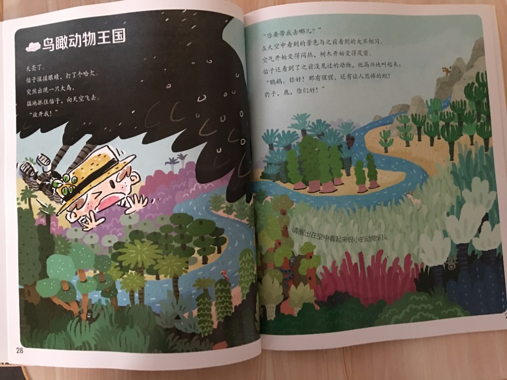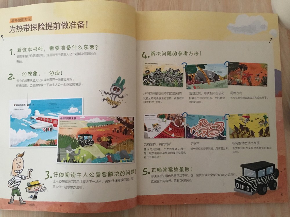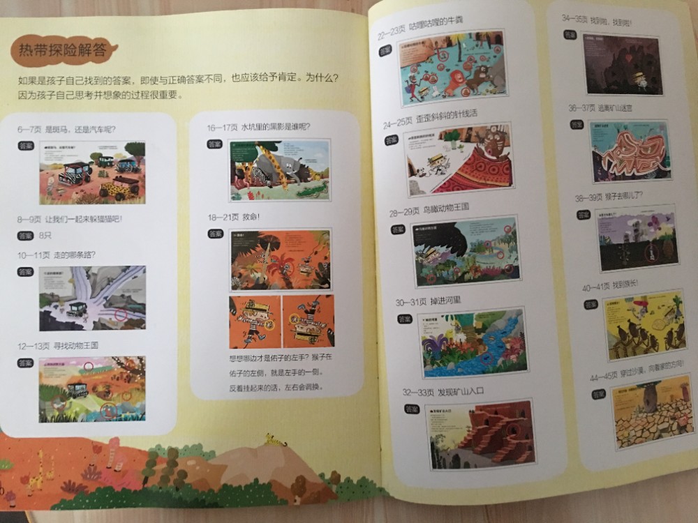 ![]() “空间思维”在现在的孩子教育中特别强调的一个理念。如果没有读绘本,我大概是想不出来要怎么给孩子灌输这样一个理念,怎么才能让她理解,有这么一个意识呢?现在的教育负担重了,但是现在的教育资源也多了,比如这套《空间思维培养书》,就是根据学龄前儿童的年龄特点和认知水平,专为儿童打造的空间思维训练的游戏绘本,能够让孩子“立起来”思考。听起来就觉得很奇妙,孩子最喜欢玩游戏了,在游戏中训练孩子的空间思维,那当然是孩子很喜欢的,毕竟玩是孩子的天性。所以我特地申请了,也很幸运得到了《热带探险》的试读。 《空间思维培养书》特邀首尔大学地理教育研究团队进行编写、韩国著名插画师进行绘制,一共三册:《热带探险》、《北极探险》、《洞穴探险》,都是精装绘本。在拿到《热带探险》时,光是看到封面就已经有浓浓的热带气息了,很自然的就被带到当中。每一个场景都是大开图,跨页展示,于视觉而已是一种享受。别说孩子,我都喜欢这种“大场面”,舒适感自不必说的了。每一个跨页都有一个主题,像是探索一个神秘世界一般让人着迷。结合游戏,更是刺激孩子的探索欲望,确实能带给孩子前所未有的体验。 在我阅读之前,女儿已经和她爸爸看过了这本《热带探险》。跟以往不同的是,变成了女儿来考我,而且还是自信满满的那种。记得有一页是数一数有多少只斑马,我故意装作不懂,看女儿是什么反应。人直接上手教我怎么看、怎么数,整一个小老师的样子。这套书还真是适合亲子阅读,也适合孩子自主阅读。带给孩子的不仅仅是视觉上的体验,还有在不同情境下如何运用观察力、思考力和判断力来进行全方面的思维能力。光是自信心这一点,就已经足以让我惊喜。但我没想到的是女儿竟然噼里啪啦和我说了一堆,怎么去找,怎么去玩,看得出来人家看书是真的有收获。我特别喜欢这个系列,不仅仅是说画面精美,更主要的是内容的选择,场景的布置,游戏的设置都是精心考量的,当中还蕴含了许多的地理知识,人土风情,注重结合孩子的基础和认知特点来帮助他们理解和掌握知识。 ![]() ![]() ![]() ![]() ![]() ![]()