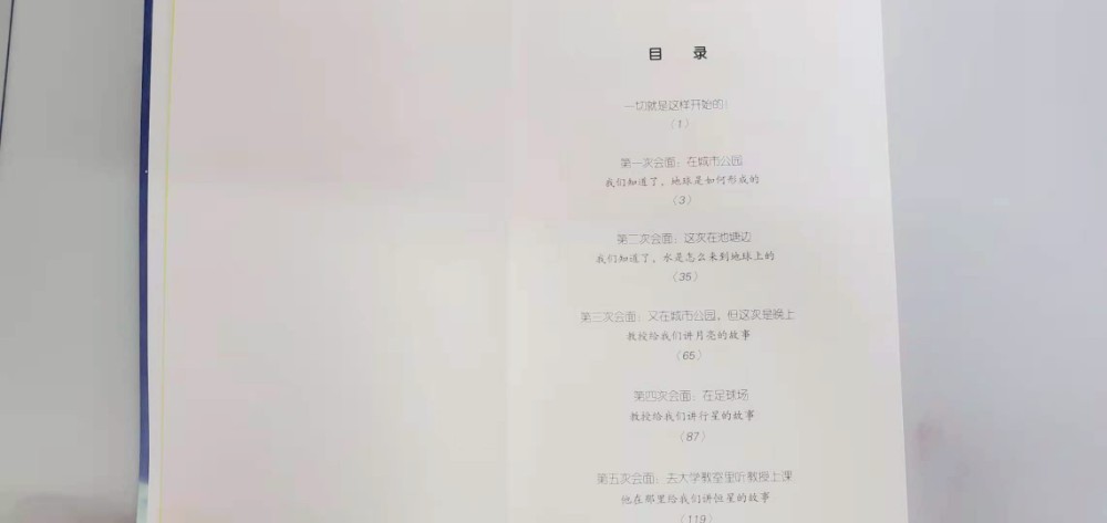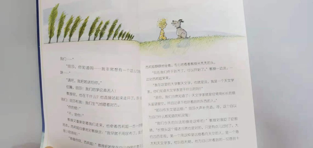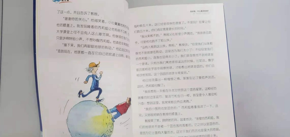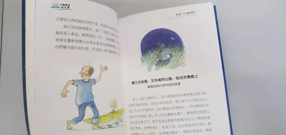 今天试读的是一本科普书《大教授的科学课》,这次的科普书跟以往的有些不同。大部分的科普书都是列问题进行解答。今天试读的书是把科学知识融入到故事中。在故事里还穿插着5个孩子之间,以及和教授之间的感情故事。把宇宙观人生观巧妙的融合在一起。 《大教授的科学课》一共有四册。每一本一个科学主题分别是《告诉我,什么是数学?》深入浅出的介绍了数学的概念。《告诉我,什么是进化论?》将地球童话讲的生动有趣。《告诉我,什么是哲学?》哲学可是比较深奥的学科,我觉得是我不能理解的。《告诉我,什么是天和地?》文中用通俗的语言和生动的比喻讲述了地球诞生的故事。我们收到的是《告诉我,什么是天和地?》一起来宇宙探秘吧。 本书32开148页全彩印刷,小主人公的生日就要到了,他想要一份特别的生日礼物。他希望有一个人能给他讲讲宇宙和地球的故事。这真是一个爱学习的好孩子。没想到真的有大学教授愿意给他讲解。他们约在城市公园里见面。小主人公还带上了四个好朋友。这位教授是个很随和的人,他们一起坐在草地上。丽莎首先提出一个问题:宇宙在不断的延申,这事为什么呢?教授说这是个很好的开始,宇宙天空都在不断的延申,但是会延申到那里?为什么延申?现在还不知道答案。这就需要我们不断的去探索了。教授很会沟通处处都表现得很绅士。从故事中我了解到四半年前第一个用长镜头望远镜看向天空的的人是伽利略。我们地球已经四十六亿岁了。是一颗岩石行星,巨大的尘埃星球在旋转中会不断释放出能量。,在不断加热之下尘埃颗粒开始融化后在一起凝固成石块,这个过程不断重复最终形成了岩石星球。因为有引力我们才能够站在地面上。而且引力永远也不会消失。地球的产生是非常伟大的事情,水会来到地球是一个美丽的幸运。在宇宙中散布着许多的气体,这些带冰的尘埃微粒和气体会因为引力而相互吸引,这些气体云越积越密,压得越来越紧。水蒸气在某个时刻冷却下来就开始下雨了。这场雨下了四万年,雨水像倒水一样倒在地球上。我们可以想想一下这个场景又壮观又神奇。宇宙万物还有很多谜底待解开。