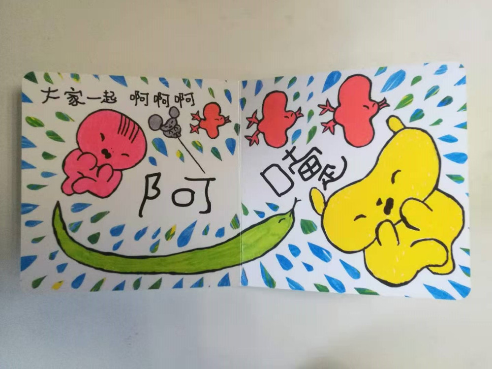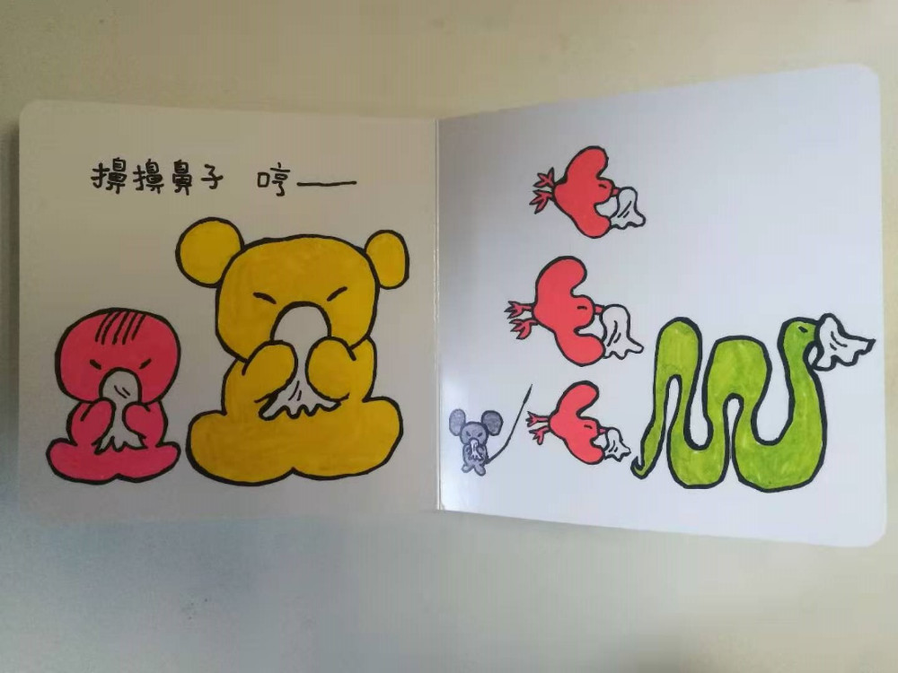 所以,给小朋友们看的东西,最好的标准就是有趣。 《阿嚏》就是非常有趣的绘本,尤其是对小孩子们来说,效果更加明显。 ![]() 这本绘本虽然是静态的形式,不过书名《阿嚏》和封面上大张嘴巴的娃娃和他身边蓝绿的水滴却产生出来了一种身在现场的动态视觉效果。 阿嚏,这个书名,本身就是一个拟声词,而且正文里面把打喷嚏的“啊啊啊”专门独立成页,做好了打喷嚏的与被动作,很让人期待后面页面会是什么样的观感效果。 ![]() 翻开下一页,喷嚏打出来了,舒展的肢体收缩,趴在头上的头发竖起,喷嚏打出来的口水四溅,这个画面很真实,也很难忘,小朋友们肯定能在连续看到小宝宝、小熊、小老鼠、小鸟、小蛇打喷嚏的场景动作之后,对打喷嚏有清晰的认知,毕竟,恐怕没有比打喷嚏这个动作更让人过目不忘的人类行为了吧。 ![]() 除了声音和动作配合所带来的幽默表演能让小宝宝们哈哈大笑之外,《阿嚏》这本绘本还有一些色彩启蒙和方位启蒙的作用。 ![]() 色彩启蒙方面,这本绘本包含了红色、橙色、绿色、蓝色、白色、黑色和灰色等七种颜色,其中绘本主角们各自拥有一种主体颜色,主角们圆圆的嘴巴是黑色的,随着喷嚏四溅而出的口水则是蓝色、绿色、黄色都有,有些还是集中颜色交织,这种小细节增加了第一视角的真实感。 ![]() 方位启蒙方面,这本绘本其实在插图中暗含了一些位置信息,比如宝宝在右侧页面居中的位置,小熊在对折页面的中间位置,他们除了原地小幅度的动作之外,喷嚏前后的位置基本不变,而小老鼠喷嚏前是在右侧页面的下面,喷嚏后到了同一页面的上部,这是上下位置的变动,小鸟和小蛇喷嚏前都在页面的左侧,喷嚏后都从左侧扩展到了页面的右侧,前是喷嚏前的准备,后是喷嚏的动作,上下、左右、前后等方位通过这些有意思的动作变化进行了生动的演示,便于宝宝们理解。 在实际的亲子阅读中,家长们可能还会发现其他一些有趣的内容,多读,多尝试吧。