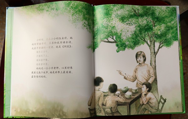 故事从作为小学老师的妈妈教兄弟三人背古诗。 袁隆平最早背诵的一首诗就是《悯农》 整本书的彩页绘画风格看起来很舒服,在用色上很讲究,每一个横跨页的色彩都做到统一,和文字内容相呼应。