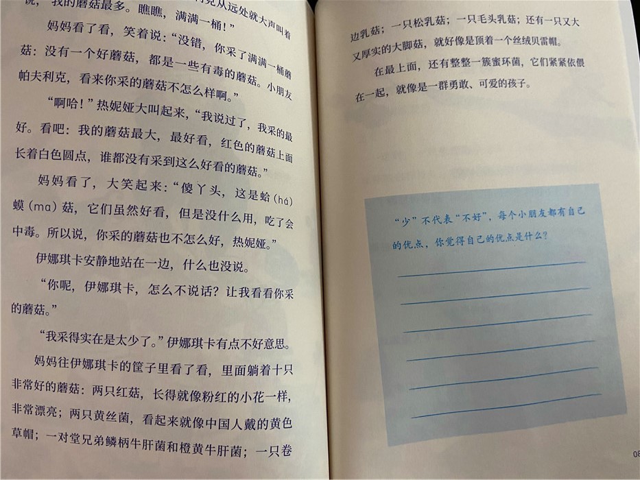 后面那几个故事都非常不错,让孩子阅读后都有一个深刻的体会。如得到珍珠后的美人鱼,与没有珍珠时候的美人鱼的明显对比,还有和爷爷有趣的聊天,偶遇鸽子等等,把童话故事讲得如此的惟妙惟肖,让人印象难忘。而且每个故事后面都提问题留白,让我们可以在阅读后把所感悟到的记录下来,慢慢地回味童话故事的本质,这个设计非常的好。