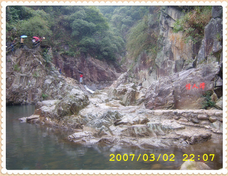 这是2007年度厦门市集美区工会为庆祝“三.八”妇女节而组织公司的工会人员去春游的活动,那天集美区工会租了两辆大巴车,把我们这些人送往野山谷游玩。不巧,那天下起了淅淅沥沥的小雨。但也阻挡不了前往去野山谷游玩的心情。有点类似倒春寒,又冷又湿又冻。 野山谷座落于同安郊区的一个山谷中,那里空气很清新。远离了城市的暄闹。确实是个天然的森林氧吧。前面有个小湖,湖里的水很清澈哦。嘻嘻,由于当时没有调好照相机的时间,时间有点错乱,我们到达目的地的时候快将近上午10点了。 我们已抵达目的地,野山谷欢迎您的横条很醒目哦。野山谷有两条线路,有一条是路是比较崎岖,从山底下爬到山顶可能要将近3个小时的路程,而且要自带干粮,不然可能会饿肚子哦。还有另外一条线路是比较短的,也就是我们爬的那条线路, 大概花了1小时的路程才返回哦。 我们沿着公路开始向山上爬行,途中经过了一个大的湖泊,水哗哗啦的流着。 继续往前走,就看见了一个情人潭,湖水很清澈见底。清晰可见小鱼在游动。 这山路也是很曲折,柳岸花明又一村。 远远的就看见一道瀑布挂前川。嘻嘻,近在眼前,可也还得走很长的一段路哦。 呵呵,九道十八弯,依稀可见有一帮人马已经走了瀑布的上方。 这下雨天的,雨天路滑得小心行走啊。泉水叮咚、泉水叮咚、泉水叮咚响。跳下了山岗,走过了山地来到我身旁。 嘿嘿,我终于爬上了瀑布的顶端,也就是我这走过来的这两边的石阶,瀑布的上方有一个很大的湖泊哦。水就是从这里飞流直下三千尺的。 爬到了山顶以后我们就沿着一条公路返回,到了山脚下的时候,食堂里的工作人员已经煮好了热腾腾的生姜汤让我们喝,为我们去寒哦。然后大家在那边吃了当地的农家野味(山猪肉)及农家菜。大家有说有笑的好不热闹,吃完了午餐,大家自由活动一小时后,就踏上了回家的路。 本作品未经作者许可不得转载,转载请征求作者意见。擅自转载使用,将保留追究其法律责任的权利! 评分记录