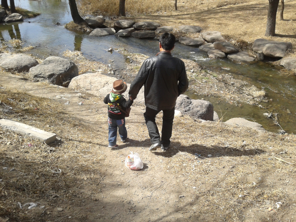 但这些丝毫不会影响孩子出游的心情,看,因为要下坡了,老爸牵着他的小手,一路向下,小家伙走的很小心,生怕滑到了。