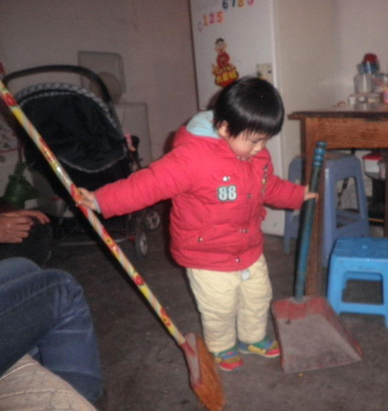 要说小孩的模仿能力真是不可小看,平时罐罐是特别喜欢把他的玩具全部往沙发下面仍,如果没见了玩具,你只要到沙发下面去找,肯定会有一大堆的,沙发下面够不着吧,我就只好用长扫把把玩具扫出来,没想到他看见了就挺会活学活用的,经常就自己去把扫把拿来玩。这不,家里来客人了,我们刚刚理了菜,我叫拿扫把,他马上就屁颠屁颠的跑去拿来了,然后自己就马上开扫了,看起来那个动作还是有模有样的哈