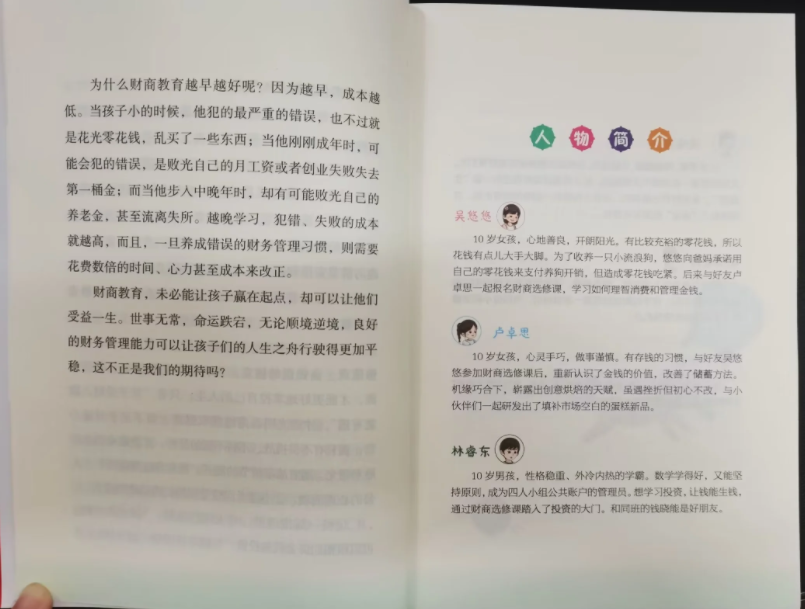 ![]() 感谢@宝宝地带网@化学工业出版社,感谢你们提供的阅读机会。 我儿子13周岁多了,是一个整天埋头学习的初一的学生。说句实话,我平时最关注的是他的学习,总以为只要孩子成绩好,将来就会过得上好日子,但其实我也知道,除了学习之外,父母更应该关注孩子的情商、财商等培养,才能让孩子在未来这个瞬息万变的社会中立足。所以当我收到来自化学工业出版社出版的这一本《博士妈妈的财商课》系列中的《一只昂贵的“柚子”》这本书的时候,内心其实很开心,我终于可以利用这本书来协助儿子进行财商教育了,虽然感觉有点儿迟钝了,但只要现在开始就不算太晚。儿子拿到这本书的时候也很开心,他说要好好学习一下理财知识,然后认真规划他每年过年收到的压岁钱到底应该如何才能增值。 这本书的作者是范颖,北京大学经济学学士、文化产业博士,多年来一直深耕在孩子的财商教育领域,是深受孩子们喜欢的博士妈妈,这一套写给孩子的财商故事课,不仅有趣、好学,更关键的是容易实践操作起来,可以说孩子读完就可以操练起来。作者在“前言”中的“财商,受益一生的素养教育”提到,为了编写好这一套适合孩子的财商教育课,参照了美国经济委员会制定的《财务能力的国家标准》,突出了系统性、进阶性、理论与实操并重、兼顾有益与有趣、不忘品格塑造等五个方面的特点。可以这样说,有了作者这样专业背景的加持,以及为孩子做好书的初心,这一套财商教育的书一定会成为孩子成长过程中的有力帮手。 作者在书中设置了四个孩子的形象,主角是10岁的女孩吴悠悠,还有10岁的女孩卢卓思,10岁的男孩林睿东和10岁的男孩钱晓能。当然作者也在书中扮演了孩子们的财商课老师范范老师,另外还有一个咖啡店店长史哲,故事就围绕着他们之间展开了,这本书一共设置了5个故事,我们先来看第一个故事:一只昂贵的“柚子”。吴悠悠跟卢卓思在放学回家的路上,遇到一只受伤的小黄狗,两个女孩子不忍心看到小黄狗这个样子,就带着它去了宠物医院包扎好,居然花了200元钱,两个女孩各自拿出了100块钱才付了医药费。现在面临的是小黄狗谁来照顾和怎么照顾的问题,卢卓思说妈妈对狗毛过敏,自己根本不敢把小黄狗带回家,吴悠悠只好壮着胆子把小黄狗带回了自己的家。 但是让她没有想到的是,妈妈坚决反对,不让吴悠悠养小黄狗,她只能跟妈妈对峙,希望妈妈能够同意。好在有了爸爸在一旁说和,只要吴悠悠同意用自己的零花钱养小狗,妈妈就会同意。吴悠悠当然没有意见,但是她每个月500元的零花钱基本上月月光,哪里有钱可以留下来养小狗呢?就在吴悠悠烦恼的时候,看到学校开设了财商课,于是拉着好朋友卢卓思一起参加了这个课程,认识了范范老师,还有另外两个男生。在第一节课上,吴悠悠就在老师的指导下,学会了做一个记账本,分清什么东西是需要的,什么东西是想要的,初步厘清了每个月零花钱到底是怎么花出去的。在这个故事的后面,还有“概念解析”的部分,就是告诉孩子“稀缺性、资源”、“决策、需要和想要”、“机会成本”等经济学概念到底是什么意思,还有“实践指导:记账本”的部分,告诉孩子如何做一个适合自己的记账本,还有“思考与练习”的部分,指导孩子们通过讨论题和实践题把学到的知识运用到实践中去。 在接下来的四个部分的内容中,吴悠悠跟小伙伴们认真地跟着范范老师学习财商课程内容,了解学习了“商品、服务、商业”等等相对比较专业的经济学概念,同时不断地把学到的知识运用到照顾小狗的过程中去,这中间虽然经历了一些波折,但孩子们对于财商课的学习更加热情了。因为大家都知道,财商教育不是一天两天的事情,更不是一蹴而就就能够做得好的事情,需要在理论学习的基础上,通过长期的操作过程来领悟学习的。儿子在读完这本书后,跟我认真地说:“妈妈,我的压岁钱是不是都存在银行呢?我可以自己来支配吗?”我说可以的,一部分用来存银行攒利息,还有一部分给你自己来自由支配,不过首先要做一个账本,让我看到你对管理自己的钱财的基本的能力。儿子很开心地答应了,然后开始做起了账本,相信他一定会在实践的过程中,掌握必备的财商知识。 ![]() ![]() ![]() ![]()