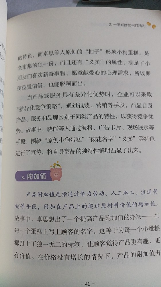 最早读一本财商书是《穷爸爸,富爸爸》看那本书的时候孩子还小,跟他说了一些书中的理念,但他还是听不懂,现在看了这本书,是孩子自己读的,而且故事里的人物和孩子的年龄差不多,他很快就能明白书里的知识。 理财这个话题对孩子来说有点陌生,他们现在的年龄段可能只是会花钱,但是对于手里的钱怎么处理,并没有明确的目标,记账本预算表这些对于他们就更是一点概念都没有了。 这本书拿到手里,我和孩子都非常认真的在看。因为好的消费观,要从小培养,我希望他能早点接触到一些财务知识。因为理财好了,才能规划好自己的生活。现在,孩子对理财概念太少了,所以他们会不计算地花钱,连大学生也常常成为“月光族”。 整本书一共有4个故事,1.为了尽快赚足小猫在宠物医院的寄养费,四个小伙伴在饭饭老师支持下去公园儿童节创意市集做准备。四个小伙伴做足了充足的准备,可到了现场才发现位置特别的偏。但是他们没有气馁,他们机智聪明,随机应变,大家齐心协力想尽办法吸引顾客。最终卖出了全部产品,取得了胜利。2. 烘培店堂食和外卖混杂的问题,范范老师决定为烘培店开辟一个外带窗口,四个小伙伴也接受了这个任务。面对种种困难,他们勇于挑战,经过一段时间的努力,他们成功的将办理在窗口的业务发展起来,取得了好成绩。3.是生意就有竞争,在烘培店等500米处又开了一家猫咪咖啡店。新开张的咖啡店生意特别的好,让四个小伙伴心里特别的紧张。面对这样的情况,他们一面侦查敌情,一面开展了价格战。但是在商战中,价格战往往却是最不理智的。小伙伴们终于,意识到把服务提高,把产品升级才是解决办法的根本。4.新制作的蛋糕不是很成功,在范范老师的鼓励下,小伙伴们通过市场调研,蛋糕有了新的定位和配方。研发出满意的产品。 每个小故事后面都有概念解析,实践指导,思考与练习在概念解析里为孩子们解释了很多不知道的新名词,头脑风暴知识产权……在实践指导里。教孩子们如何利用思维导图去记录大家的创意,利润的计算……思考与练习里面,就是通过本章故事去发掘一些自身的潜力和对故事的理解。 现在的生活节奏越来越快,生活压力也越来越大,孩子们在未来面临的问题也很多,他们要学会正确的消费观和正确的理财观,这样他们的生活水平会得以提升。希望这本书对孩子们能有帮助。 本作品未经作者许可不得转载,转载请征求作者意见。擅自转载使用,将保留追究其法律责任的权利! |