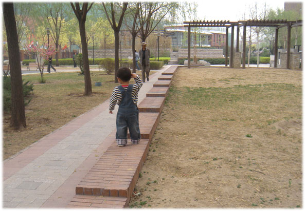 有宽阔的大路他不走,偏偏总喜欢独辟蹊径,去迈这个较窄的石板路。姥姥从大路老早就走到路口去等他了,小家伙还不慌不忙的踩着石板、迈着他的小碎步~~好不容易走到了小路的尽头,他又继续沿着又细又窄的小路边冲姥姥走去(小孩子好像都喜欢走这种小台阶式的不正规路线,我上学时也喜欢专找窄台阶来‘练平衡’,呵呵)……