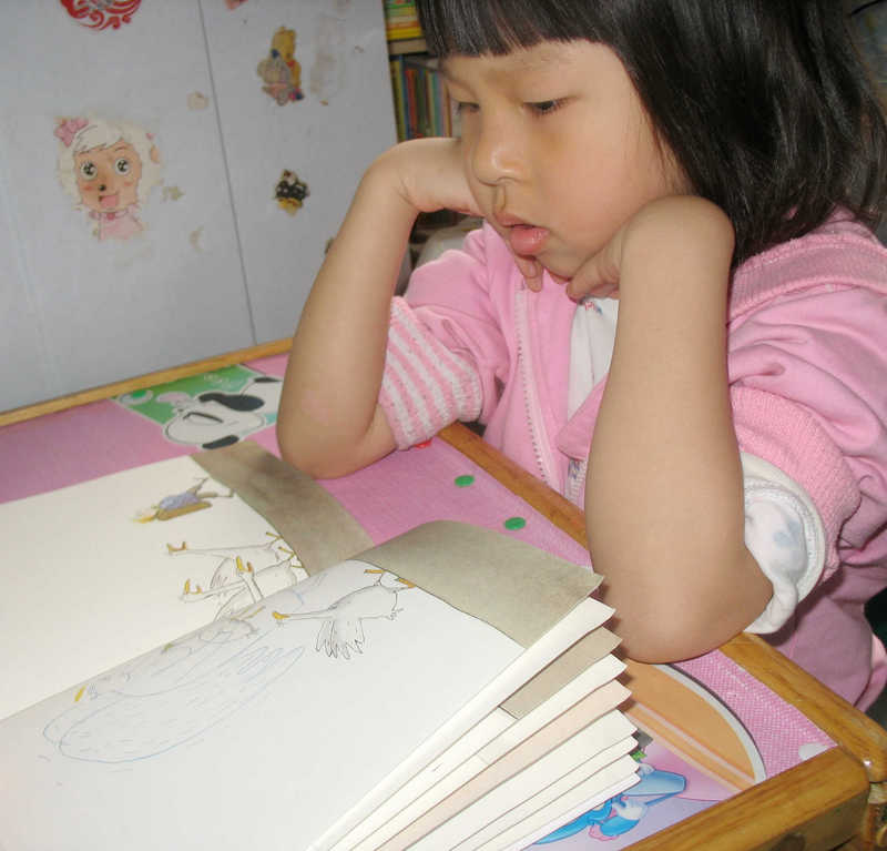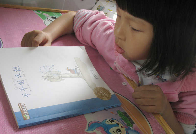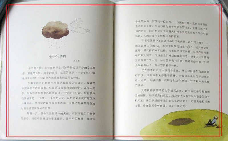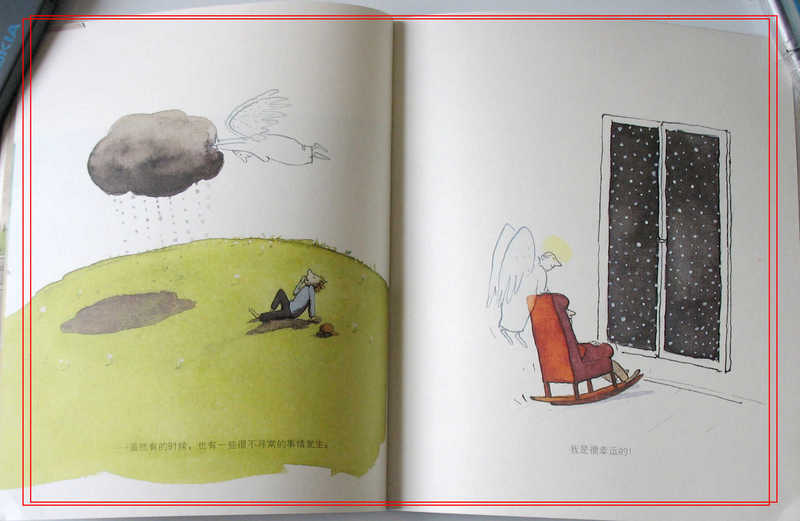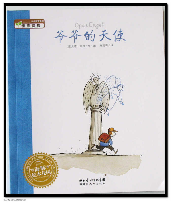 关于死亡的概念,田田曾经不只一次的问过我,人为什么要死?她不要死,妈妈也不能死,爸爸也不能死。她认为跟她亲近的人都不能死,她要好好的,就像现在一样,一直这样。孩子一边哭一边说着这些。我被女儿对生命的渴望所感动,尽管她可能并没有理解这样深,只是不能接受人死了,失去了的感觉,但是她要好好的活着,而且一直就都这样,恨不得有天生不老药,呵呵,我认为女儿的思想是乐观的,积极的。所以我对女儿说:人会老,也会死,这是自然规律,所以我们要珍惜我们现有的生命,积极、快乐的享受每一天的幸福生活,女儿赞同的点点头。 ![]() 清明节从来也没有给田田正式讲过这个节日,总是能在这一天看到街边或河边有人烧纸,田田会很奇怪,会跑去看看,也会问我:妈妈,他们在干什么?我也不避讳的告诉她:他们在给死去的人烧纸,送点纸钱,田田很好奇,但心情很沉重,他不想听到死。这时田田总会说:妈妈你不想死吧,我也不想死,要是我们一直活个一百年就好了。是啊,一直活着,而且一直不老,多好呀。 ![]() 今年的清明节田田已经四岁多,她对于死亡的概念已经初步有了自己的想法,那就是:人总会死的,所以没什么可怕的,只要现在跟爸爸妈妈在一起就好了,爸爸妈妈会陪我长大的。因为田田释然了,所以我也就为她选了这本《爷爷的天使》来给她讲讲关于生命的美好想法。 《爷爷的天使》讲述了病重的爷爷躺在病床上,向懵懂的小孙子讲述了自己的一生:爷爷小的时候遇到了一位天使,从此,天使就一直跟在他身边,帮助爷爷顺利地度过一个个难关……当爷爷睡着,小孙子离开医院时,爷爷的天使飞了出来,来到了小孙子身边,成为了他的天使。 作者用朴实简洁的文字描写故事、自由的线条勾勒出活泼的插图,再以轻柔的色彩,对应着爷爷面对生命慈爱的包容和知足,提醒着我们在人生的道路上,不要无精打采地走着,或许在某个转角处,又是一片光亮! 在讲的过程田田一直对于这个天使很好奇,她说:为什么这个天使从这个雕像上下来了,他为什么要陪着这个小孩?这个问题让我感觉比较难回答,我说:这个天使是天使像的灵魂,因为他天天看到小孩从这里走过,他喜欢他就去帮助他了。也不知道这样说对不对,但田田满足了,不再追问。到最后爷爷闭上眼睛,孩子从医院走出,我问田田爷爷怎么了?田田说:爷爷睡着了。我想孩子还不能明白爷爷就这样去世了【我在篇头并没有告诉爷爷生病的事】,只是奇怪为什么天使又去跟着小孩了,我告诉他那是爷爷的天使,这个天使又为了爷爷而去保护小孙子了。田田问我:妈妈,那我以后是不是也会有天使,呵呵,多么美好的梦想呀,我说:会的,因为有我们…… 《爷爷的天使》中从广场的天使石雕像中分身而出的一个守护天使,灵魂似的和爷爷形影不离,天使总是在最危急的时刻张开双翼庇佑着爷爷。这个天使并不是我们想象中的那种漂亮的天使,而只是一个普通的,既不优雅也不庄严,圆乎乎的身材,喜怒形于色的表情,倒像是一位妈妈、一位朋友一样。蓝色线条画出看不见的天使,但她却能化解爷爷许多的灾难。天使传达了无形的信仰,同时也象征了周遭人们对爷爷的宽容和爷爷心中的感恩,人的态度才是化解困境的要素。 来看看这本书吧: ![]() ![]() ![]() ![]() ![]() ![]() ![]() ![]() ![]() ![]() ![]() ![]() ![]() ![]() ![]() ![]() ![]() ![]() ![]() ![]() ![]() ![]() ![]() ![]() 认真看书的田田: ![]() ![]() ![]()