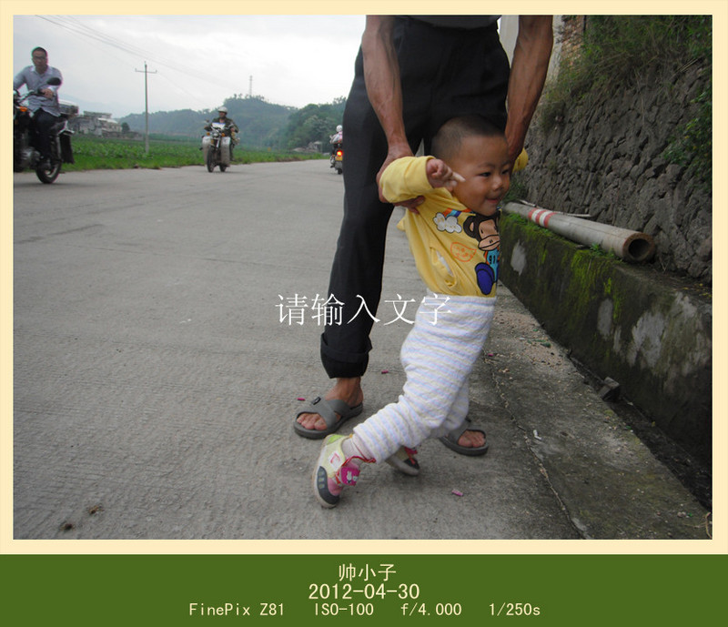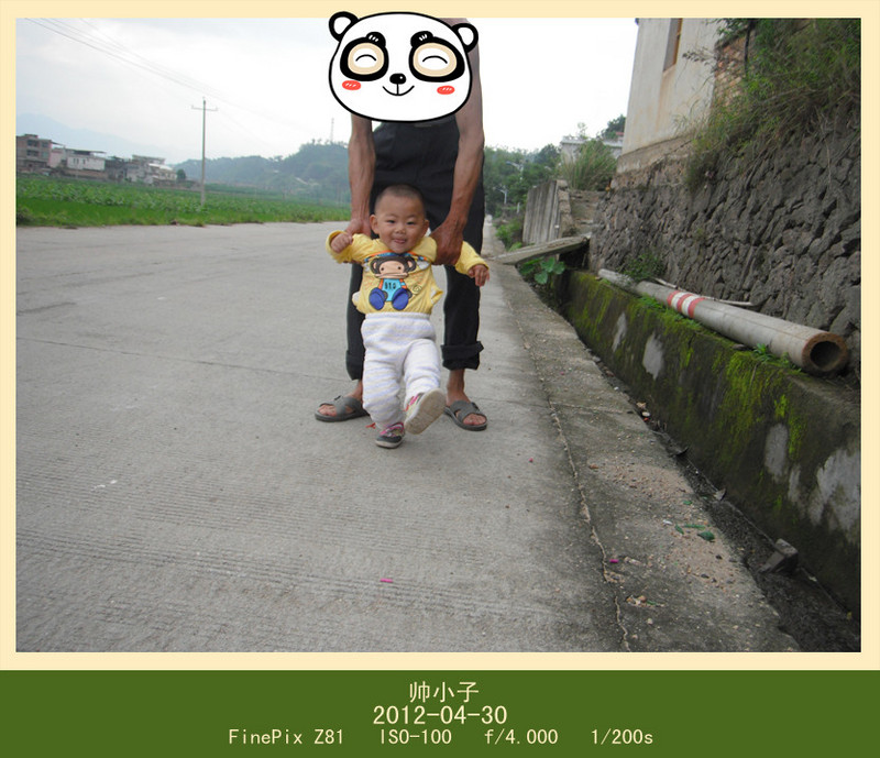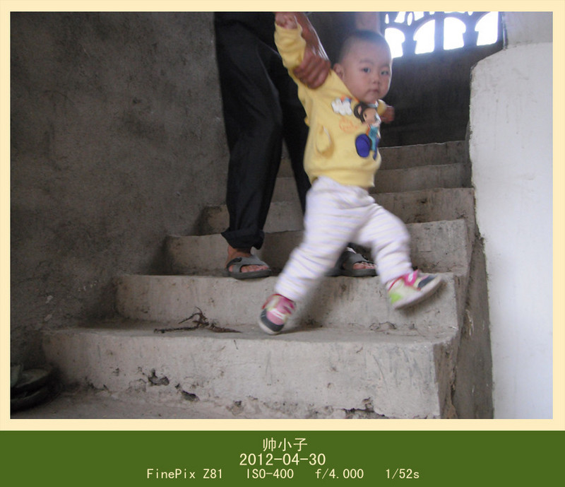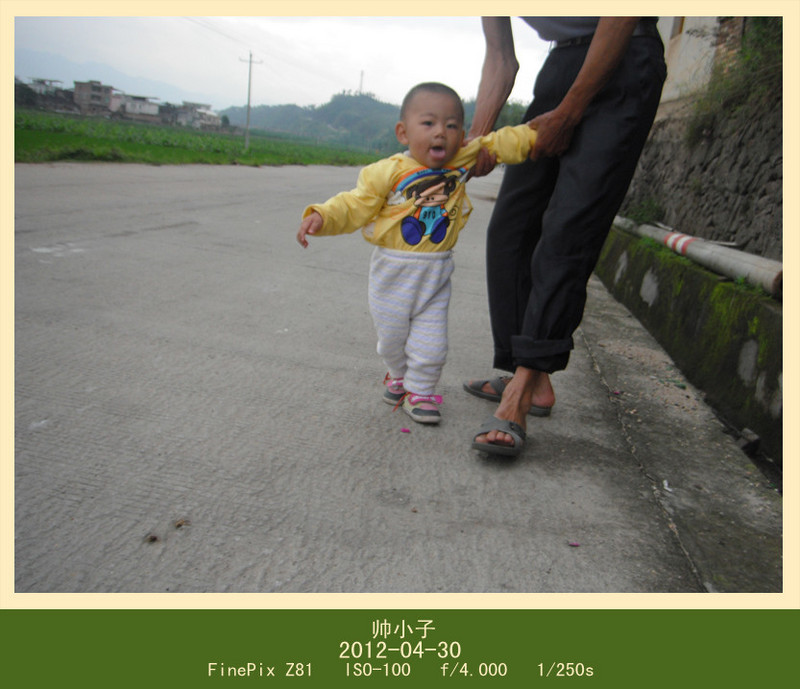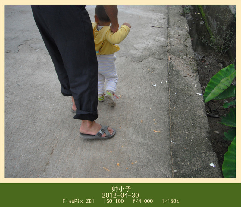 这次回家,宝宝虽然还是不能独立行走,可比清明节回去时,大有进步,之前是两手牵着,现在是牵一手,有时也让他单独走几小步,他比较胆小,独立走的时候是闭着眼晴的,宝宝是用闭着眼晴来表示他害怕摔倒,这点太出乎我意料了,遗憾的是没有抓拍到他闭着眼晴往前走的瞬间。 每天早晚,宝宝的爷爷都会带着他出去训练两回,雨天的话,就在家爬楼梯。 宝宝爱走路,但不爱穿鞋,总是想办法把鞋子脱掉,奶奶只好在鞋后跟缝了两条绳子,固定鞋子。看到宝宝鞋子上的红绳子了吗?