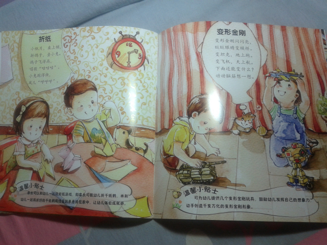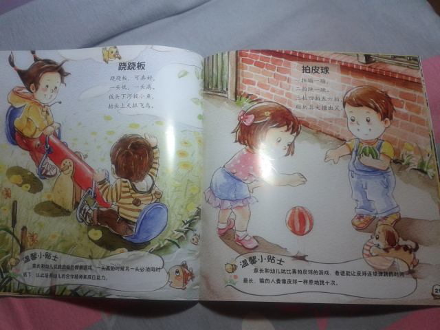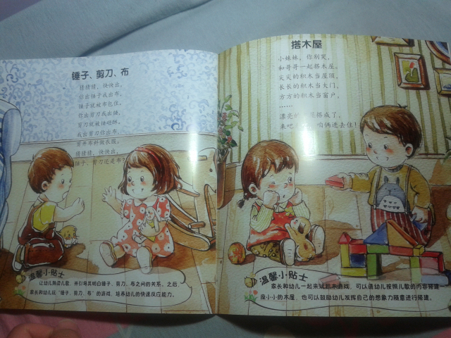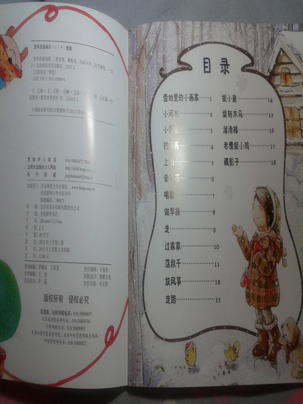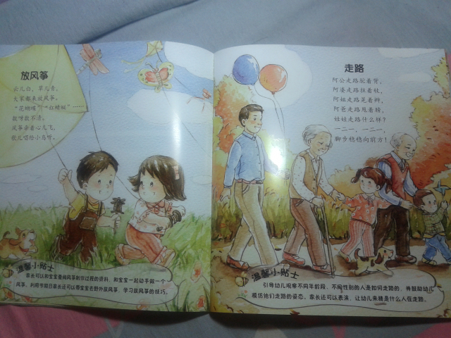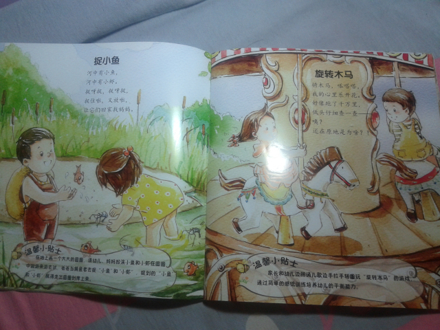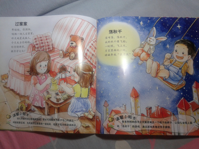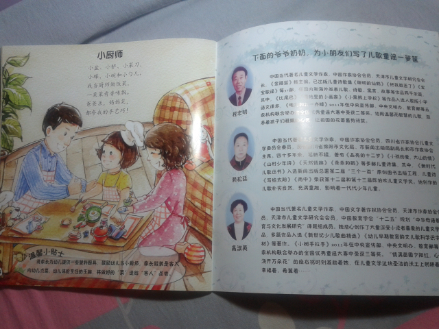 首先,表示抱歉,收到这本试读图书有一个多星期了,可是这个星期一直比较忙,都没顾得上写试读报告,呵呵,今天趁着工作不太忙,赶紧把试读心得发上来喽。。。。 刚刚收到这本书,给我不一样的感觉,因为以前给儿子也买过童谣的书,但是通常都是比较小本的,而且里面的人物大多都是特别卡通的,而且像这本书这样满满的一页画面的特别少,这本书给我的感觉特别好,首先是有些铅笔画的感觉,淡淡地,小清新的感觉,但是颜色却搭配的很好,适合宝宝阅读。 其实,我拿到图书后,大致地翻看了一下,里面童谣的内容很丰富:《雪地里的小画家》、《钓月亮》、《旋转木马》、《溜滑梯》、《放风筝》……内容特别贴切孩子们的生活,我感觉孩子肯定特别喜欢里面的内容。