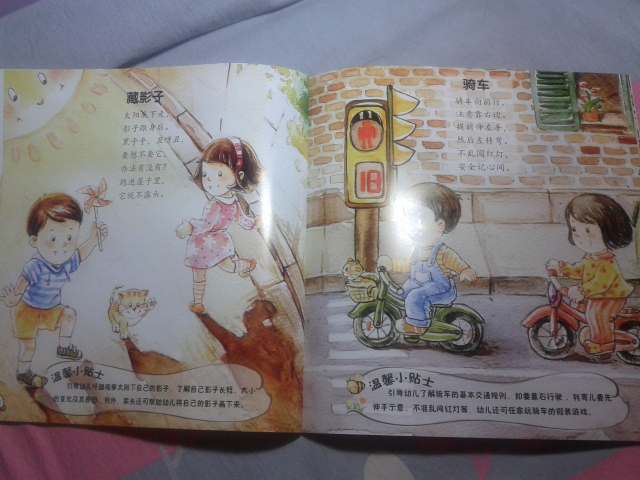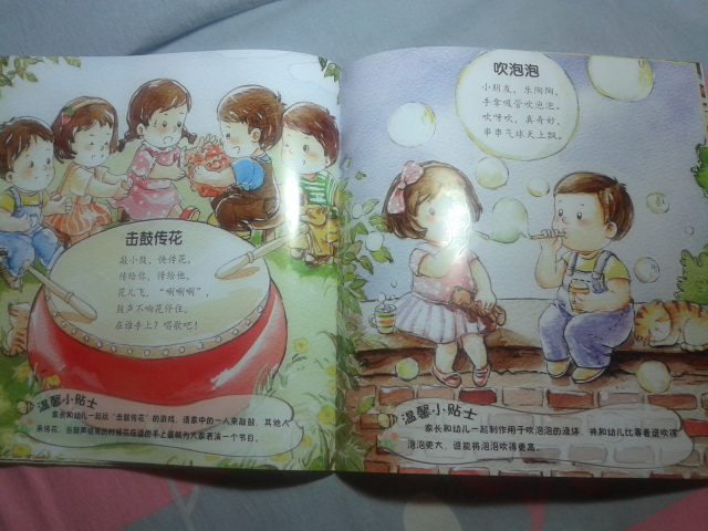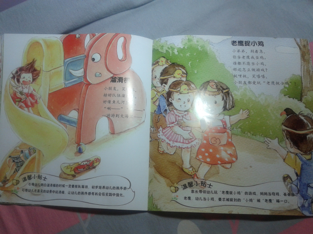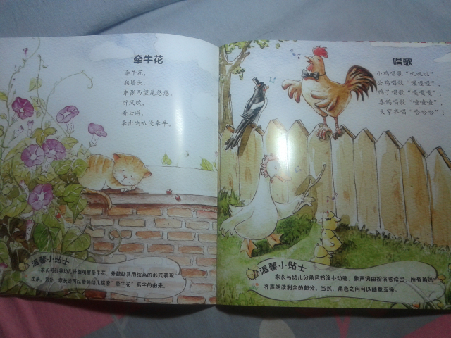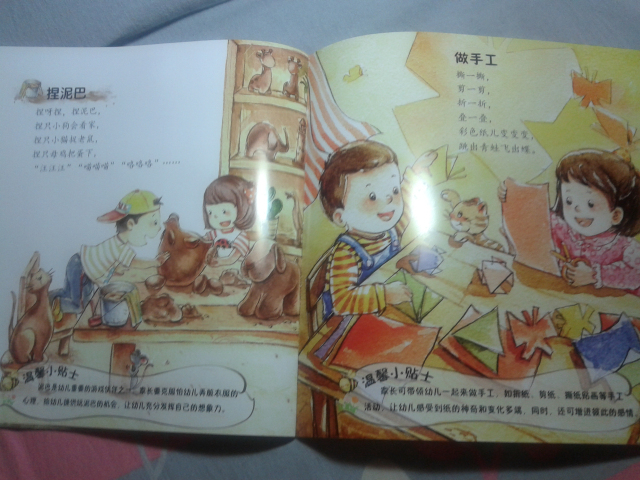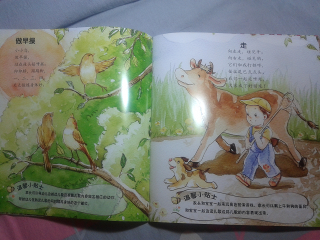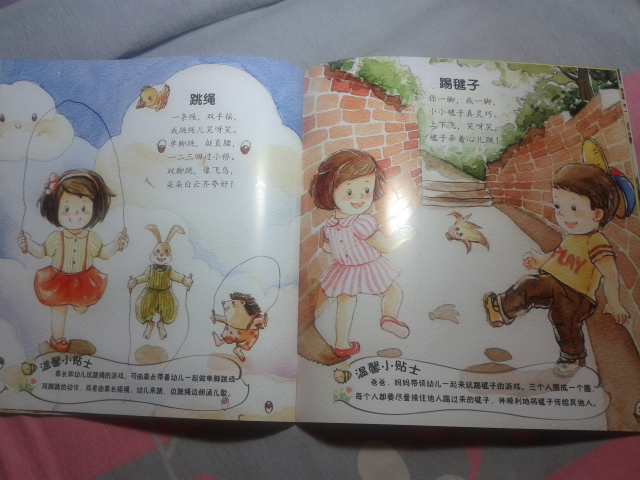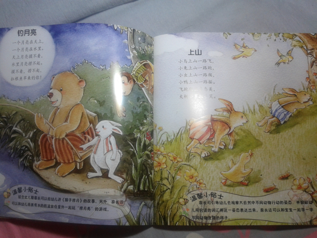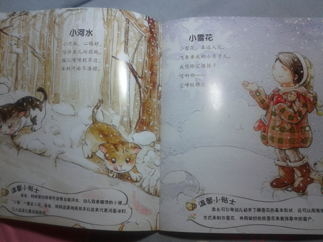 下面给大家简单介绍几个里面的小童谣: 《雪地里的小画家》 雪地一群小画家, 争先恐后来画画。 小鸡画竹叶儿, 小狗画梅花儿, 小鸭画扇面儿, 小马画月牙儿…… 这应该是我们大家熟识的一篇小学课文了,到现在我还记得当时学这篇课文的感觉,觉得特别可爱,通过这首小童谣,孩子们能清楚地记忆各种小动物的脚丫形状哦。 更可贵的是每篇童谣下面都会附着一个“温馨小贴士”,就像下面的这一个—— 温馨小贴士:家长可引导幼儿观察不同动物脚印的特点,和孩子一起来做雪地里的小画家,尝试用树枝等工具在雪地里画出自己想画的东西。 这个温馨小贴士,给我们家长一个提示,告诉我们可以从哪些方面引导孩子。