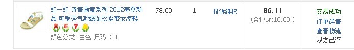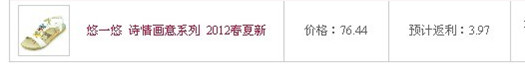 首先就鞋子了,本来上次就已经买了两双了,因为是坡跟的,穿起感觉有点累,还是只能穿平底的了,而且还在那一家买的,觉得质量还不错 价格也不是很贵,加上邮费才86。44 另外不知道你们有没有用过淘宝网的淘粉吧,通过淘粉吧去购买,可直接返钱到你的支付宝里面,也就是说,象我这双鞋子都返了3。97,本来是86。44-3。97=82。47才是实际付款金额。但这个必须是你收到货后,确定了才自动返钱的 还是来看看实物吧,怎样,简单,大方吧 还买了两件衣服,都在同一家买的,因为有一件是包邮的,再多买一件也免邮了,两件一共113。8,也是通过返利购买,最后实际是109。7。好象没有返多少钱,但这个每个牌子的返利不同的,反正是根据你当时实际付款的金额来返的。我觉得很不错了,积少成多,也会节约一点点了,呵呵 衣服的实物图,这个质量不错,穿着应该很凉快的,就是稍微短了点 这件就很合适了,大小,长短都很好 哈哈 怎样,还不错,价格便宜,又不用出门去逛街,直接送到家,又方便 本作品未经作者许可不得转载,转载请征求作者意见。擅自转载使用,将保留追究其法律责任的权利! 评分记录