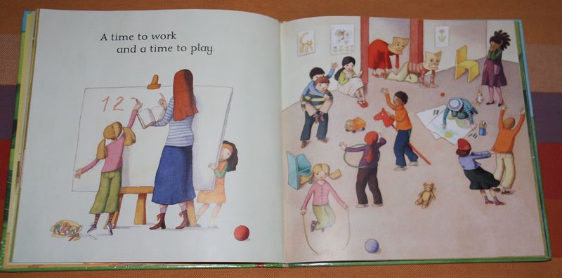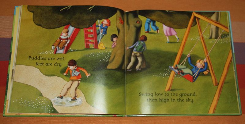 Puddles are wet, feet are dry. Swing low to the ground, then high in the sky. 小荃似乎一直对荡秋千有恐惧心理,忽悠忽悠的她有点害怕。读到这页时我夸张的跟她讲秋千的好玩儿,不知道会不会起作用。 A time to work, and a time to play.