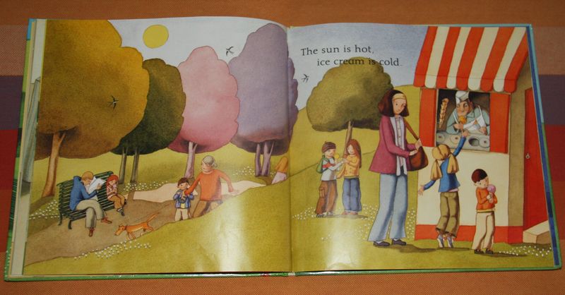 The sun is hot, ice cream is cold. 这页总是要大看特看,终于,她最近也吃到了我买的冰淇淋,下一步估计要品尝不同口味的了。Babies are young, grandparents old.