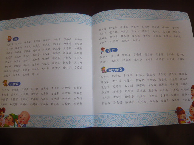 ![]() 以前儿子小的时候三字经,唐诗都能背很多了,后来不教也就不会了,主要是也不懂里面的意思。这个弟子规和三字经有点类似读起来也是朗朗上口,偶尔给孩子读读也还能接受的,中国是礼仪之邦,这些文化、礼仪、基本的规矩还是要让孩子知道的。书还是蛮厚厚的一看就是正版的,一看标价要12.8呢真是赚到了啊!希望以后能好运多多! ![]() 《弟子规》主要是古代学生言行规范的总集,列述弟子在家、外出、待人、接物与学习上应该遵循的守则和规范,让孩子知仁,懂礼仪。这些东西孩子接触的还真是少呢,平时总是让孩子要有礼貌但就是这么一句空话说不出什么具体的来,这本书里可是介绍的很详细,而且字体清晰,配图生动,下面的译文孩子也很能明白理解,真是孩子学习为人处事的必需品! ![]() 在这里我就简单列举两页让大家看看: 弟子规 圣人训 首孝弟 次谨信 泛爱众 而亲仁 有余力 则学文 译文:《弟子规》的内容是依据古代圣贤的教导编成的言行规范。它告诉我们,首先,要孝顺父母,尊敬师长;其次,要言行谨慎,讲究信用,如果还有多余的时间和精力,就去学习文化知识。 父母呼 应勿缓 父母命 行勿懒 父母教 须敬听 父母责 须顺承 译文:父母呼唤我们的时候,应该立刻回答,不要慢吞吞地答应。父母要我们去做的事情,不要拖拖拉拉。父母的教导,我们要恭敬地听,并牢记在心。父母责备我们的时候,我们要顺从并接受。 这里给全文有了一个分类:总叙、入则孝、出则弟、谨、信、泛爱广、亲仁、余力学文。 国学是孩子学习中华文化的必经之路,通过学习国学,可以帮助孩子打好语言基本功,陶治性情,提高个人综合素质。在潜移默化中,孩子出口成文,自然快人一步。现在爱好国学的孩子也很多,不过可惜我们孩子接触有点少和父母关系还是比较大的。 ![]() 虽然我让孩子学习这些没有期望那么多,只不过觉得做为一个中国孩子应该了解中华文化,懂得礼仪,为人处事,但是现在的孩子尤其在礼貌待人和尊敬长辈方面还真是比较欠缺的。学习这些应该会有一些进步不管是对待家里的父母长辈还是学校的师长,以及社会上的交往都是有帮助的,而且对以后学习语言都是有帮助的。其实有些东西我们大人也根本没接触过,可以和孩子一起学习一起进步也是一件很快乐的事情。不过这里面也有些东西可能对于现在这个时代来说有点绝对了,现在的家庭很多都追求和孩子可以做朋友那种方式相处,不过基本的礼仪规范的言行和做人原则还是不能忘的。 ![]() 昕昕一边翻还一边念着三字经呢,这本才刚刚拿到还读不来,但我读的时候还是很喜欢听的,而且译文部分能听懂应该对他还是有很大影响的,希望在他的人生道路上是一个很好的指引!