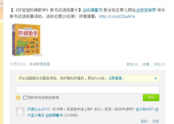 宝宝性别:女孩 宝宝年龄/预产期:2岁5个月 运费支付方式:其他 提交体验报告日期。规定时间内 申请试用理由/宣言:一直在找这样的书,终于在这看到了,我家心心已经对数字有一定的认识了,很想通过这样的书让她再印象深刻点,很希望试用成功,真的很想很想得到这样的好书! 已关注“幼狮童书”,并评论转发了哦!