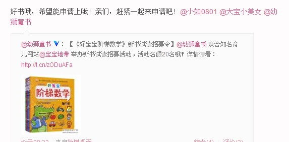 宝宝性别:男孩 宝宝年龄/预产期:1岁3个月 运费支付方式:其他 提交体验报告日期。规定日期内 申请试用理由/宣言:好书不能错过!!! |