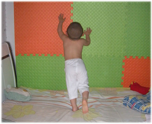那天在床上玩的时候,他又跳起了自编的舞蹈,后来觉得不过瘾,跑到墙边去扒铺在墙上的泡沫地垫。这是姥爷怕他脑袋撞到墙而精心设计的保护层,为了方便拆卸,没有给钉死,所以很容易就被秃秃给扒下来了……姥姥见状赶紧跑过去阻拦,秃秃觉得好玩,一次又一次的挑战着姥姥的耐心,他一次又一次的把板子扒下来、姥姥一次又一次的把板子扶上去、他再一次又一次的给扒下来……如此反复了好几遍,姥姥终于压不住的发火了…… 秃秃一看姥姥真的不高兴,不再去扒贴在墙上的板子,而改为去往床边桌子上摆的大箱子上面爬……那样做是很危险的,姥姥情急之下厉声冲他大喊“你要敢上去,我就敢拧你!”,秃秃停止了攀爬的动作说“我不上去”,姥姥问“你不上去你那是干嘛呢?”,秃秃说“我喝口水”……我和姥姥当时都无语了,他这个小东西,实在太会为自己找借口!呵呵~~