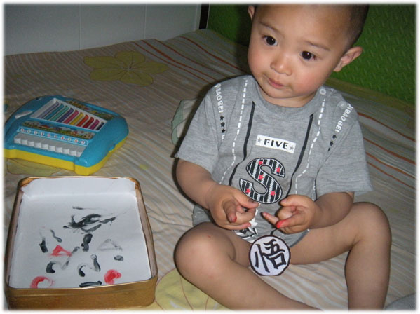 小家伙对红色的喜爱超出对黑色 可是,他看着手指上的红色,更有些怕了 可能感觉像是流血了吧~~
