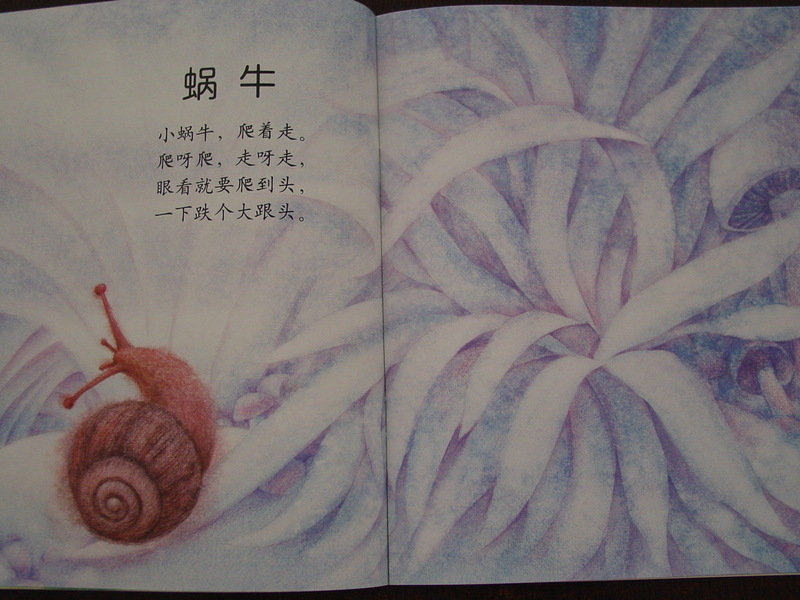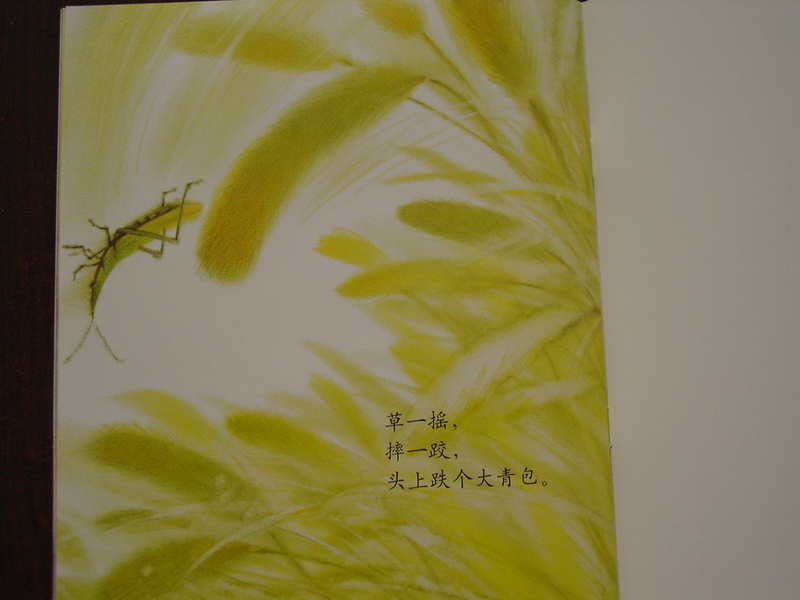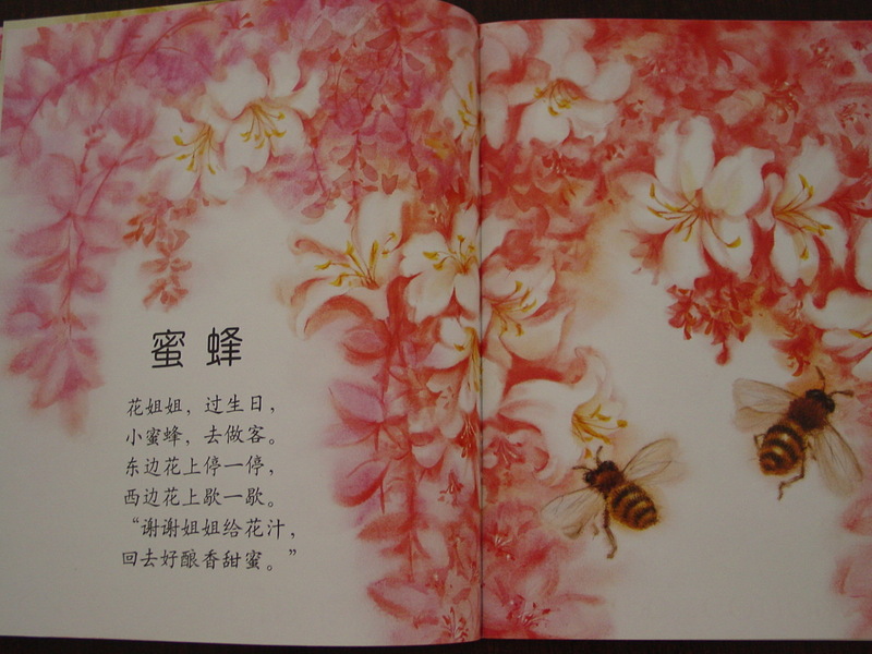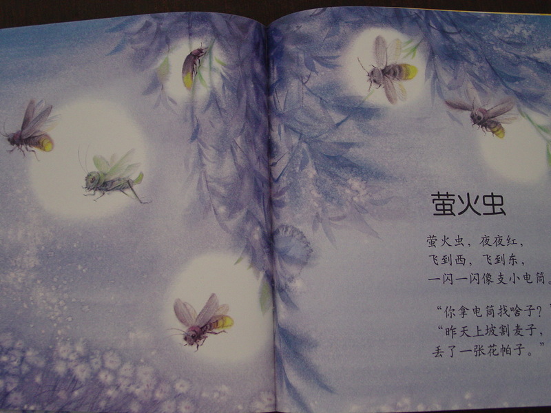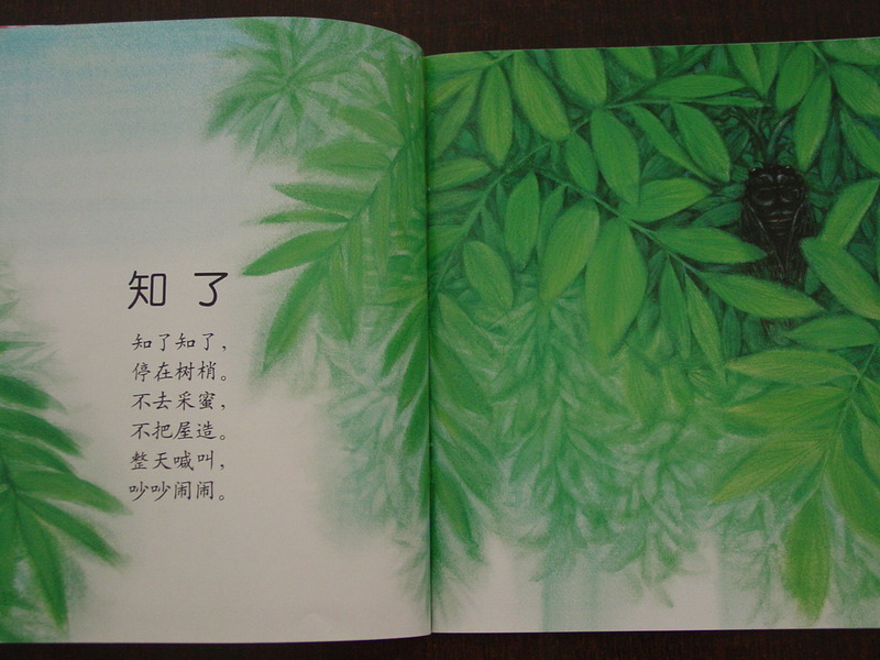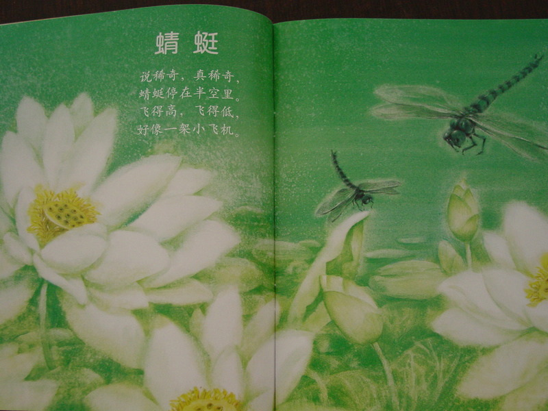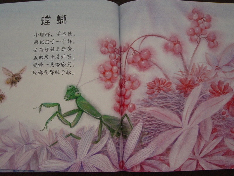 一旦进入夏季,各种小虫子都开始出来活动了!当妈妈的可要操心了,怕宝贝被蚊子叮的满身大包,怕知了的叫声吵得宝贝睡不好午觉!想带着宝贝去看看外面的漂亮的花儿,可是又怕花丛是采蜜的蜜蜂蛰到孩子!还有那吓人的蜘蛛,当妈妈的看到了都毛骨悚然!可是宝贝却执着的要去抓!让妈妈很是无奈!但是虫虫们也有可爱的地方哦!下面跟着阳妈一起来看看夏日里虫虫们的可爱之处吧! 这本《夏天到来虫虫飞》也是中国少年儿童新闻出版社,出版的幼儿文学60年经典,中的一本!作者张继楼把这些可爱的小虫子都编辑成了朗朗上口的儿歌!绘画张蔚昕,画的更是如梦幻般的美丽,很是吸引孩子的眼球哦!宝贝很喜欢我在夏日里给他一边看这些唯美的图画,一边读这些儿歌! 看着粉粉的荷花的海洋,飘着几只快乐的蝴蝶!你是否感觉到了夏日的清凉呢! 四个字的儿歌,即使1岁半的宝贝,都可以跟着妈妈一起读哦!要是宝贝贝知了吵得睡不着,那就起来和妈妈一起阅读这关于知了的儿歌吧! 虽然说是夏季的故事,可是知了却是一直唱歌到秋天的哦! 宝贝来摸摸这可爱的花姐姐上面的小蜜蜂吧,这个蜜蜂不会蜇人的!但是真的蜜蜂,你可一定要小心哦! 现在城里的孩子很少能够看到蜻蜓了!那就带着孩子去野外寻找吧! 雨后的草丛里,公园里,都可以找到可爱的小蜗牛的,妈妈们可以带着宝贝去寻找,说不定会有惊喜呢!小蜗牛很安全的哦,可以让宝贝和小蜗牛亲密接触!宝贝一定会很兴奋的! 蜘蛛可是大家都不太喜欢的动物,可是他的织工却是让人佩服,还有他的屡战屡败,屡败屡战的精神,是我们学习的好榜样呢! 螳螂的故事,很多很多,在《黑猫警长》中,也有他的介绍哦!他吃害虫,宝贝庄家,可是益虫哦!可是大家很难再城市中见到! 夏日的傍晚,带着孩子在习习的凉风中区野外吹吹风,乘乘凉,说不定就会发现可爱的萤火虫了,和宝贝一起唱唱萤火虫的歌谣吧! 嘘,谁在唱歌,呵呵,原来是叫哥哥啊!叫哥哥又称蝈蝈,到处可见,妈妈爸爸们带着宝贝去桌一只回家好好研究一下吧! 哈哈,最常见的,蚱蜢出来了!他喜欢跳跃哦!可以让宝贝和他做个游戏,学学他跳跃的动作,看谁跳的高,跳的快! 好了,这本书看完了,宝贝们快和妈妈一起出门找一找他们吧! 本作品未经作者许可不得转载,转载请征求作者意见。擅自转载使用,将保留追究其法律责任的权利!