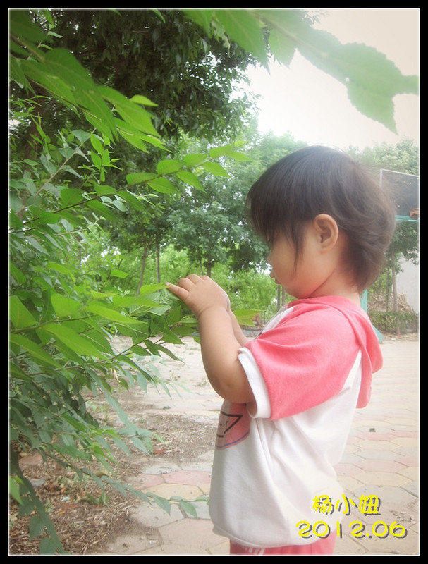 妞妞就跑到这些小树前面,拽着它的小树枝就说:“HI,小树叶,你好!”呵呵,礼多人不怪,妞妞上来先跟小树打个招呼~ 然后拿起一片小树叶就左看看,右看看的捉摸起来,那表情好像在研究什么稀有品种,总想着能在上面找出些惊天秘密似的。 “小树叶,你吃饭了吗?”妞妞摸站小树叶关心的问。“你妈妈呢?”“你妈妈上班去了呀?”“你真听话,妈妈不在家,我们不哭是吧?”哎哟,这一唱一和的居然和小树叶聊起来了。呵呵,她还说要给小树叶唱首歌呢,竖起耳朵来听她唱的什么歌。 “小树叶,我给你唱首歌听哈~”想了想,歪着头对它说,“我给你唱首‘小树叶’的歌吧!” “小树~叶~~~,是绿色的,一片一片真好看!” 哈哈,这一共没几个字,却被她拉的声音长长的,还说是唱歌呢,就跟老先生背诗一般,搞笑S了。