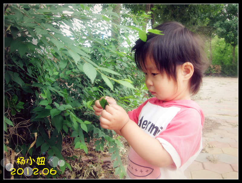 妞妞大概是看到小朋友们那里有大把的树叶,所以大大激起了她的好奇心,也跑到广场边上的小花坛里摘起了小树叶。这花坛边上种了许多的树,还有一些小树,好多都是不知道怎么自己就冒出来了,冷不丁的就会长出许多的小树来。大概是旁边的大树钻出来的小树苗吧。