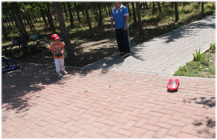我们带孩子去公园可算是‘重装上阵’了!他爸开着车,后备箱里拉的全是摇控玩具,有大飞机、小飞机、小汽车等等……这几样都是秃秃的最爱(他的最爱太多了,其实完全可以把这个‘最’字拿掉,不过,我还是想这么形容,哈哈!),小飞机玩够了,改小汽车!小汽车没电了,改大飞机!大飞机玩坏了,又改向别的娱乐设施奔去…… 这次来秀秀我家小秃秃玩摇控小汽车的片片吧~~本来这是他爸以孩子之名,给自己买的礼物,结果自己没玩几次,到被儿子经常‘试驾’了……在公园里,他爸拿出小汽车刚跑了没多会儿,小家伙就一溜烟的跑到爸爸跟前,又是讨好、又是软磨硬泡,愣把摇控器给要到手了!看来他爸心情真是不错,也不怕孩子把汽车给撞坏了~