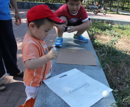 在公园的时候,秃秃看到有位奶奶带了两个白色的小球,觉得很有趣(他好像对一切球类的东西都有兴趣)。看他跑过去管奶奶要球玩,我赶紧也追了过去,严肃的提醒他不要管别人要东西。可这位奶奶人还挺好,虽然跟我们不很熟悉,但还是热情的把球借给秃秃玩,还告诉我,这是棒球,不怕摔,孩子喜欢就随便玩,没关系的……