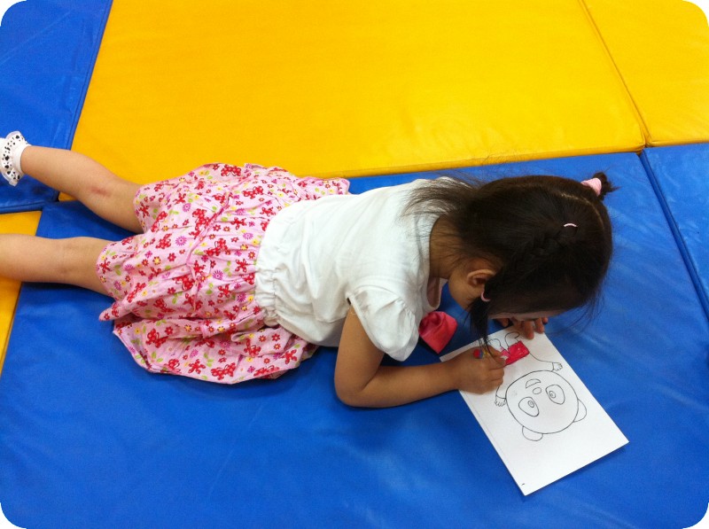天妈说,上次在某早教机构买的冰上表演票,那里赠送一次活动,叫我们一起去。也不知道是什么活动,反正是要带着贝贝玩的,就去了。我们去的稍微晚了一点,大概有10个左右的小朋友,加上家长,还挺热闹的。贝贝简直是撒欢了,根本不像平时在外面的她,跑、躺、大笑,可能这个环境让她觉得自在吧,还有好朋友天天和她一起撒欢。
