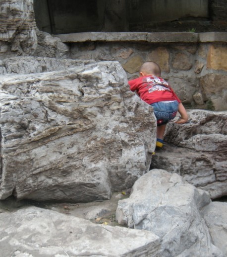 看他玩起来没玩没了的 我和姥姥就说我们要走了,不管他了 小家伙一看我们要走,有点着急 可突然不知道要如何从石头台阶上下来……