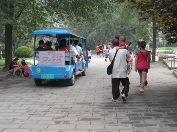 后来看见了公园里观光的小巴车 秃秃哭着喊着非要做那小车 我们不知道那个车子要从哪上去,就劝他说回头再陪他坐 可他不干,非说:现在!现在就坐~~ 小家伙到处跑,姥爷到处追 追了半天才把他给抱起来 可秃秃还指着小巴车非要现在就去坐呢……