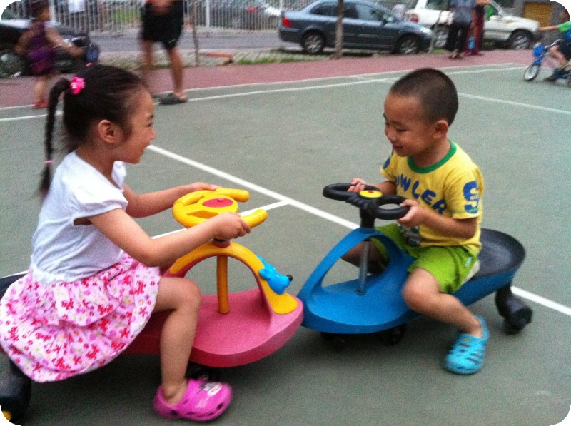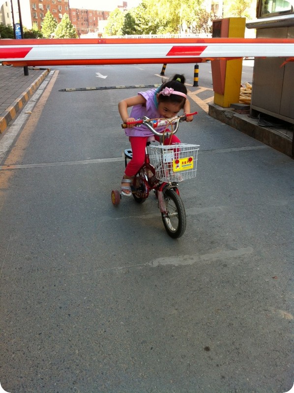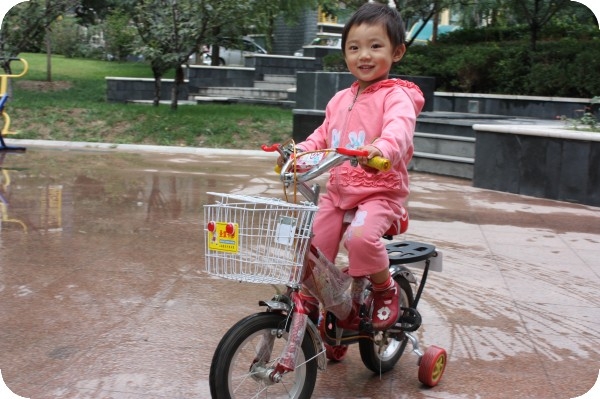 快要四岁的贝贝 不到两岁的时候,贝贝看到小区里好多小孩骑自行车,就上去摸摸,甚至上去骑,小小的她居然可以骑的动。于是,在两岁生日的时候,她有了第五辆车——自行车。一开始,她只能半圈半圈的骑,随着练习的多了,她无师自通的学会了骑整圈,刚会蹬整圈的时候,因为不熟练,速度不如骑半圈快,所以一旦和小朋友快速骑,她不自觉的又会变成半圈,但如果慢慢骑,就整圈了。这辆车的使用频率很高,一直骑到现在,两年了。座椅给调高,轮胎换了一个,她又美滋滋的骑着。昨天晚上,五个小孩一起,他们给自行车上帮着彩带,一边骑一边大叫着“结婚了,结婚了。。。。。。”感情是结婚车队啊,哈哈,看着他们快乐的身影,在一起聊天的大人们也发自内心的微笑着。 雨后,专门要下来骑自行车踩水,呵呵