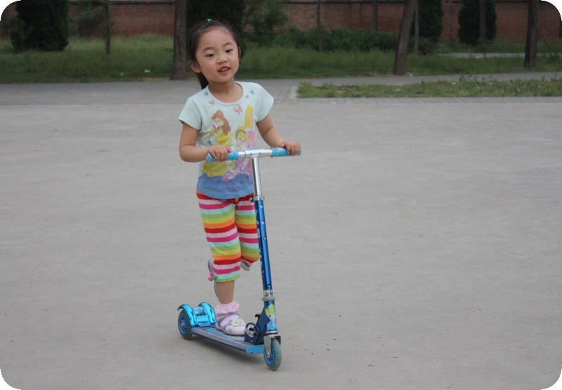 骑车钻杆,哈哈 两岁八个月,购置了她的第六辆车——滑板车。当时是在广场上看到一个六七岁的小女孩在骑,娴熟的技巧快速的飘过,觉得好帅啊,拿起来掂了掂,非常轻的车,质量很好,很灵活,问了价钱,并暗暗记下牌子。回家之后在淘宝找到了相同的车子,以比店里便宜一半的价格拿下。刚开始骑滑板车的贝贝,没有帮着她扶一下,全是她自己摸索着骑,从慢到快,一年的时间,她已经掌握了非常娴熟的技巧,在她这个年龄段的女孩子里,算是骑的相当好。每天晚上一到两小时的自行车滑板车锻炼,增强了她的体质和身体协调性,增进了小朋友之间的友谊,非常好的运动方式。