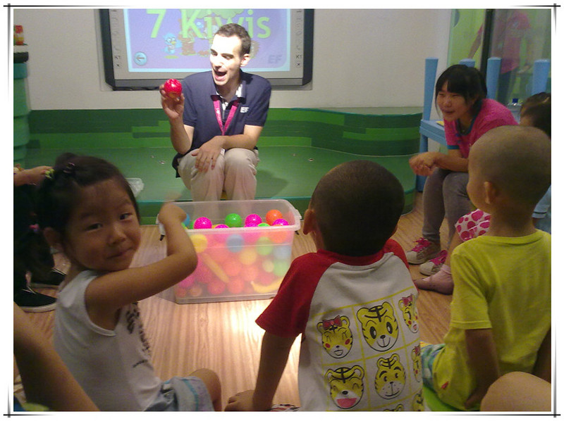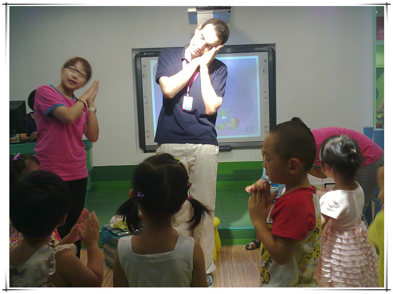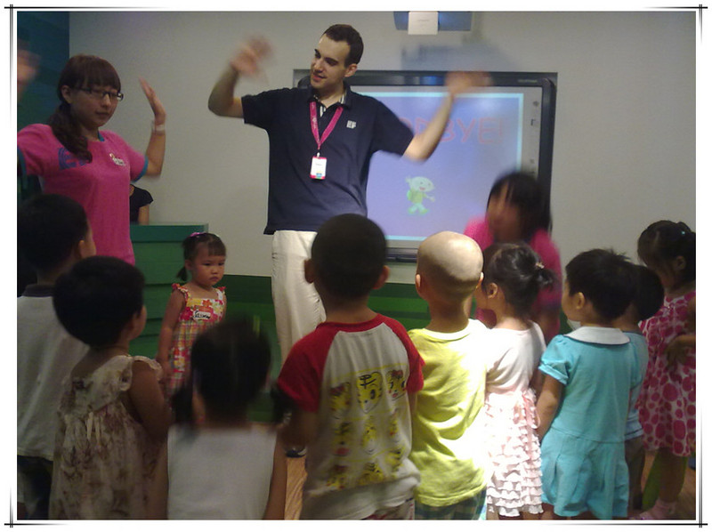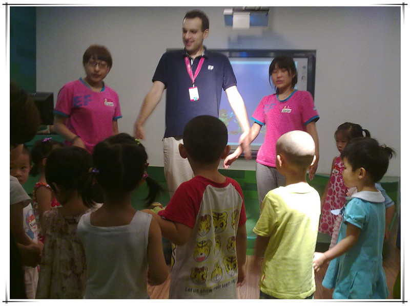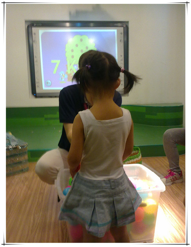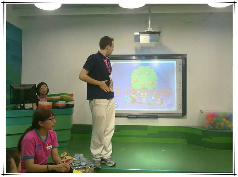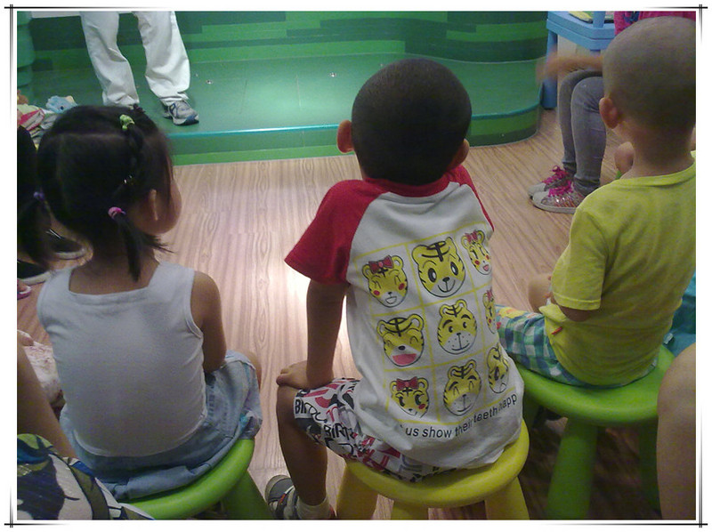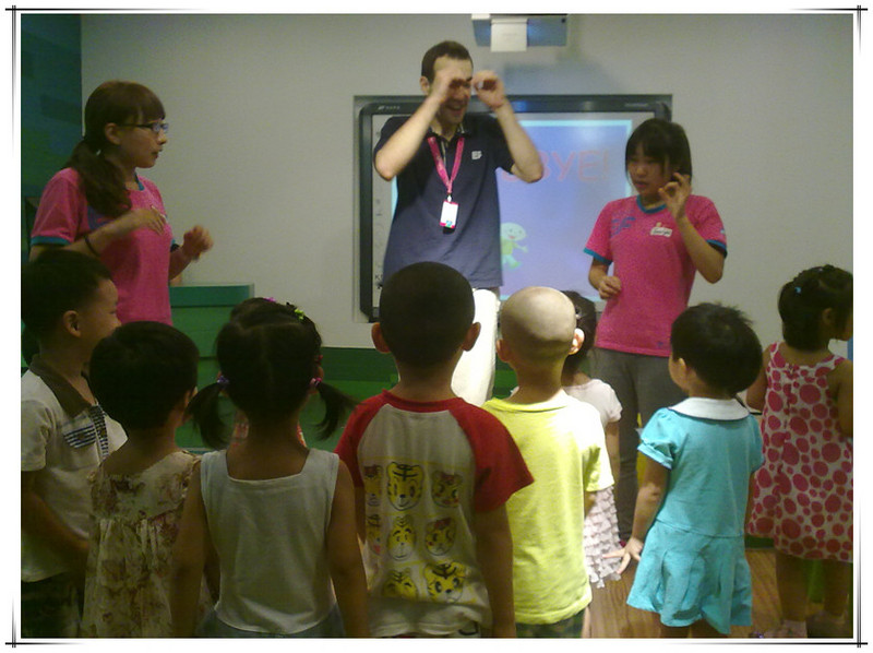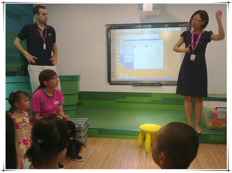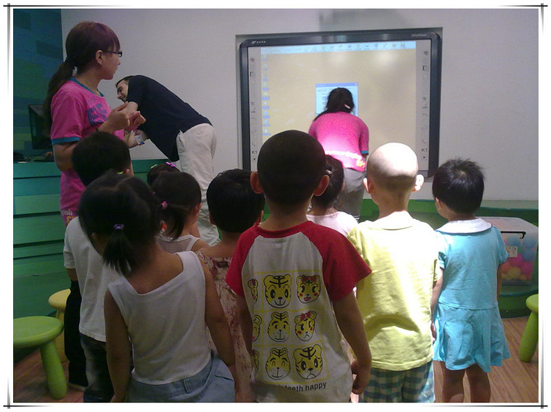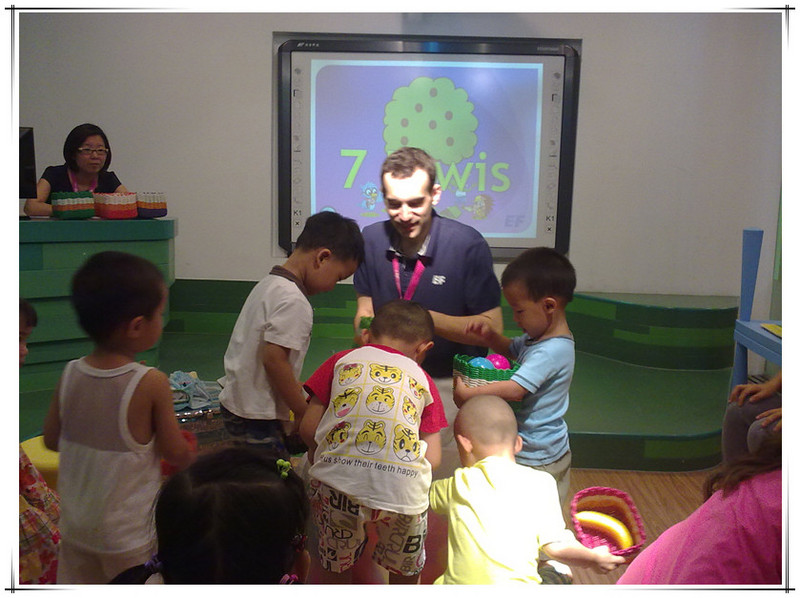 这次体验课由外教主讲,有两个中国助教协助,另外还有一个中教负责操作电脑和投影仪。先上图片吧,直观一些。 非常高兴的是这次拍了好多照片。本来不好意思拍的,因为其他的体验课都不许拍照的。看到有的家长用手机拍照没人制止,妈妈赶紧拿出手机来咔嚓咔嚓。已经习惯了留下敬仪成长的每个瞬间,不拍照还真觉得遗憾呢!