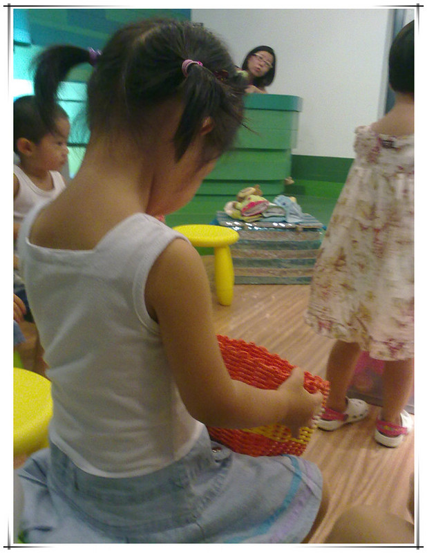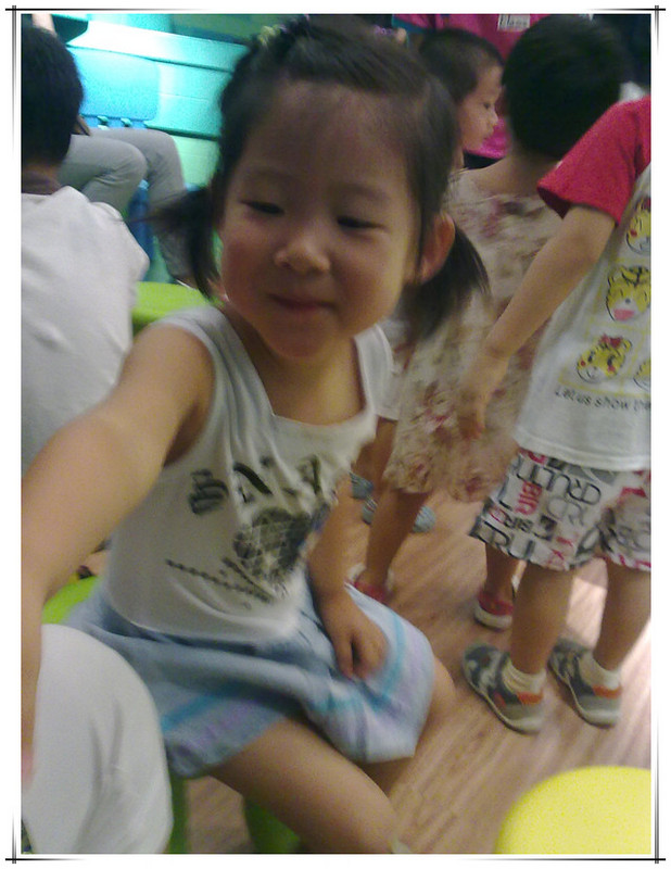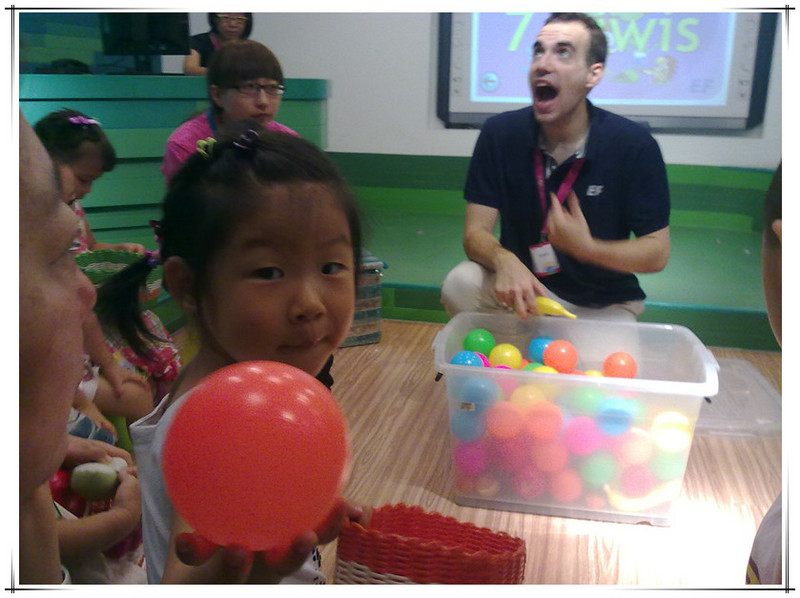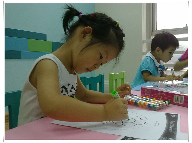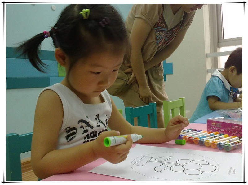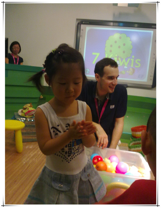 孩子们坐在前排的小凳子上,家长们坐在后排。 ![]() 左边这个小姑娘就是敬仪宝贝。 这节课的主要内容是:打招呼、互相介绍自己的名字、认识几种水果、一到十内的数字、运用 I CAN 句型。 和迪斯尼的体验课一样,也是由HELLO歌开始,结束于GOODBYE 歌。但整体感觉迪斯尼的外教上课更生动,课堂更有感染力,更好玩!不过无论如何,上英语课有外教才正宗,比中教强太多了,毕竟那是人家的语言。 一开始外教介绍了英孚英语教材里的主角,教孩子们说“HELLO, MY NAME IS ..., WHAT'S YOUR NAME”?并且一一问孩子们。学过英语和没学过英语的孩子一看区别就出来了。 然后,外教拿出一个透明的盒子来,介绍孩子们认识水果和数字:1 APPLE、5 ORANGES、7 KIWIS、BANANA... ![]() 外教发给每个孩子们一个小篮子,每个孩子拿着篮子去透明的盒子里取东西。 男孩儿先上去 轮到敬仪了,敬仪取了几个球,还有香蕉。 该敬仪上台把篮子里的东西放回透明盒子里,并且回答老师的问题:WHAT DO YOU TAKE? 敬仪自然听不懂外教说的啥,不过没关系,她为自己的表现鼓掌,并且高兴地回到了座位。 下面是I CAN 句型。 I CAN SLEEP, I CAN RUN, I CAN FLY, I CAN JUMP...孩子们站起来和老师一起边说边做动作。 ![]() 最后到了唱GOODBYE歌的时候了,老师唱着“HOPE TO SEE YOU AGAIN",一边做手势。 ![]() 最后孩子们被安排到楼上游戏室,家长们继续在这间教室里听中教讲述英孚的历史以及课程。听了一会儿感觉一时半会儿没有停下来的意思,妈妈就上楼找敬仪去了。反正我们也没打算报名,了解而已。 敬仪在楼上涂色呢,高兴着呢! 又一次英语试听课结束了,敬仪的表现一次比一次好。虽然她听不懂,但她不排斥并且还有点兴趣。这就够了!!了解并且感兴趣,这是目前妈妈带她听英语课的目的!!至于学习英语,那就慢慢来吧!路漫漫其修远兮,吾将上下而求索!!