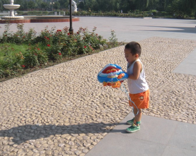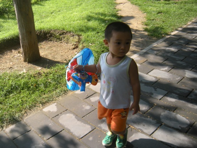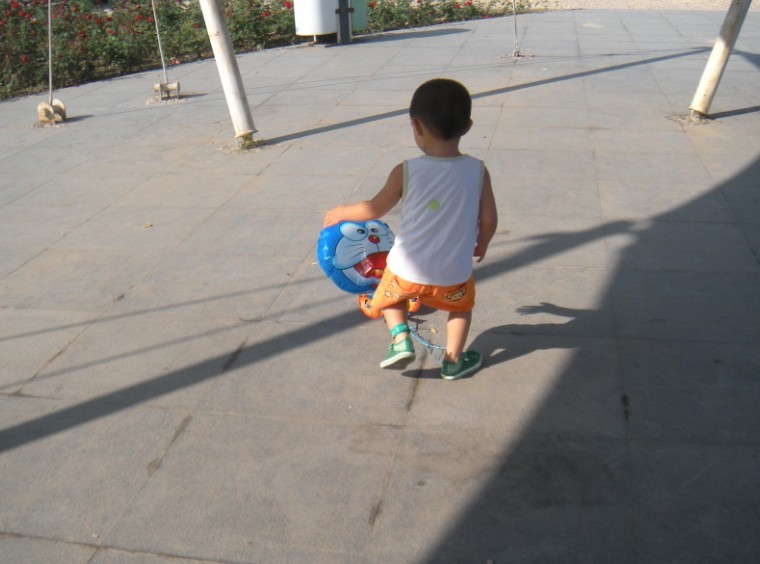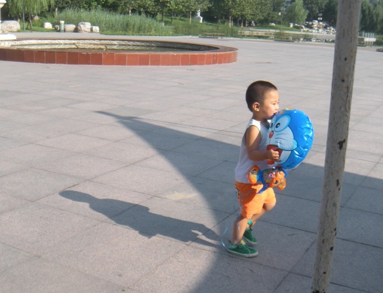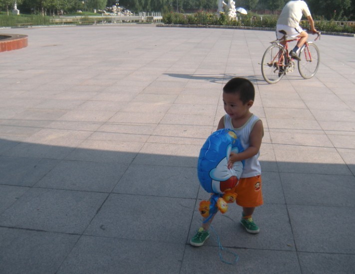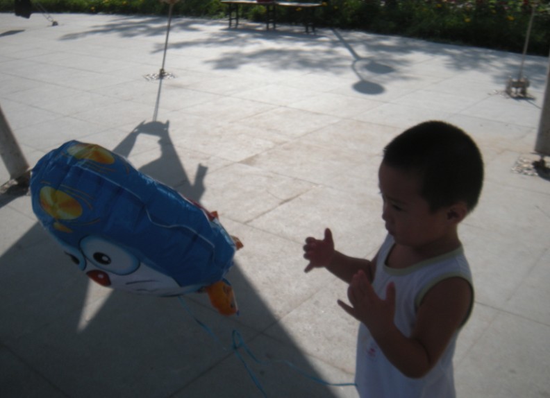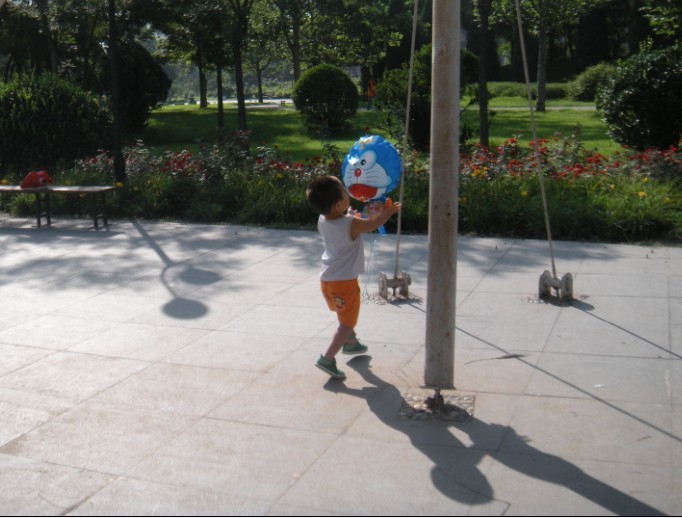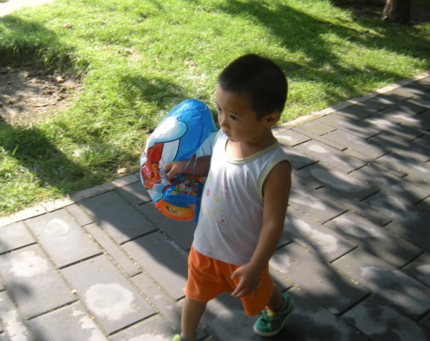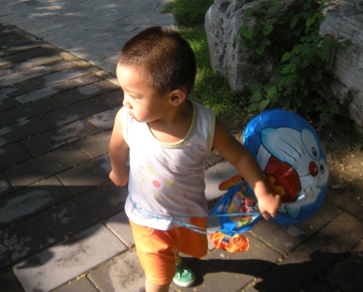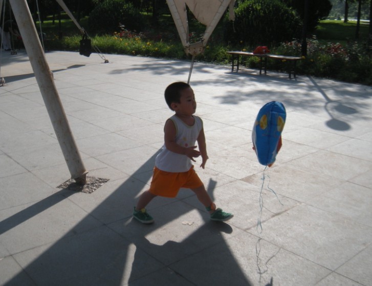 小家伙抱着气球在公园广场上跑来跑去 有时候还自己把气球往天上拍 它已经没什么氢气了,所以不会自己飞……