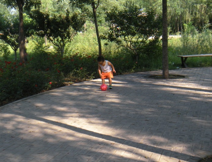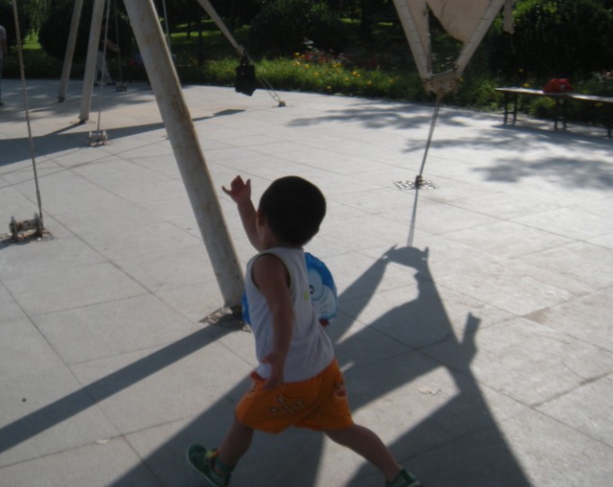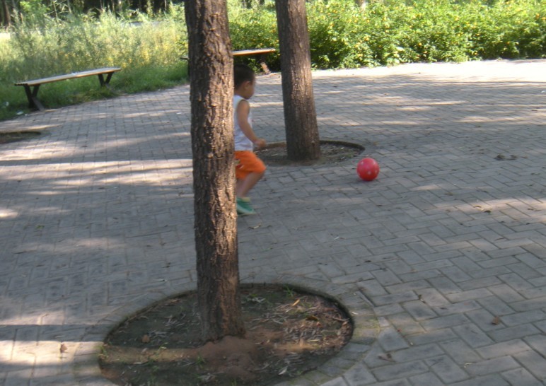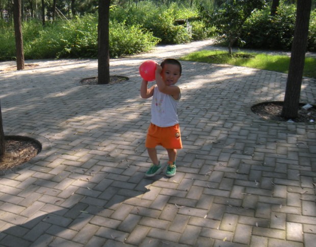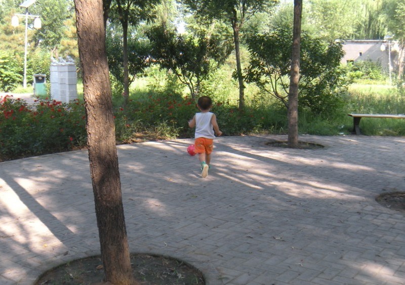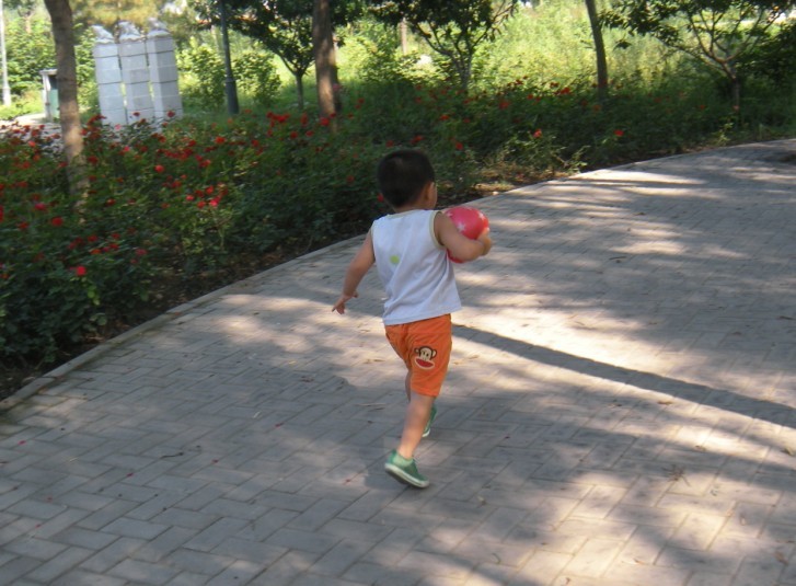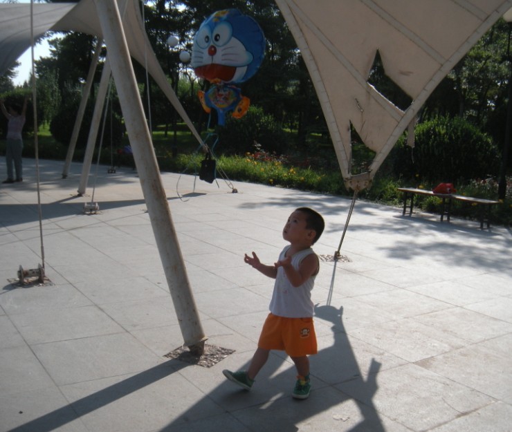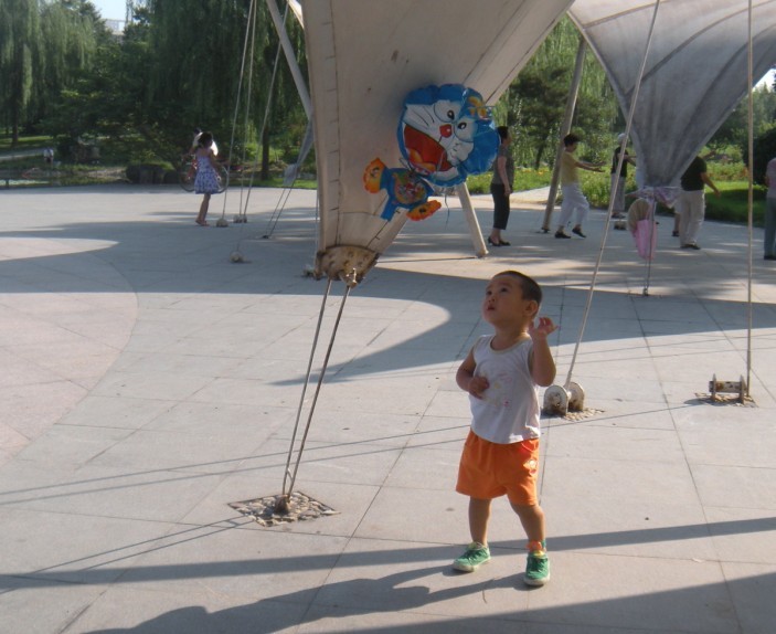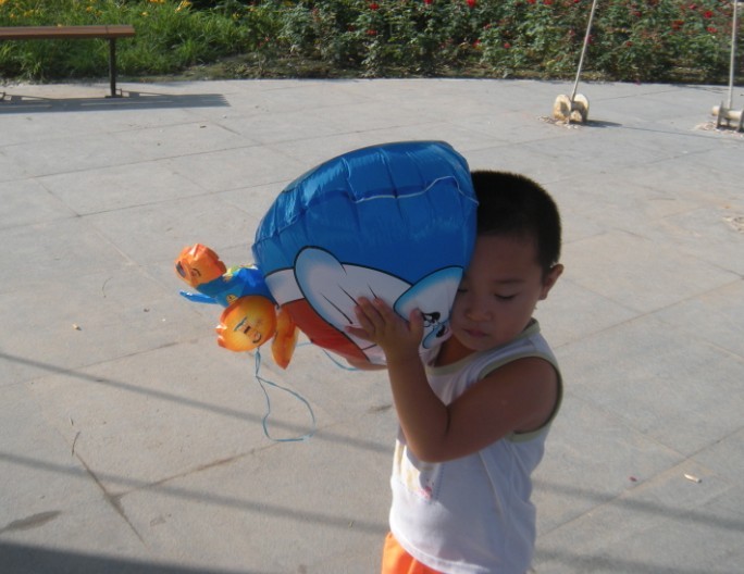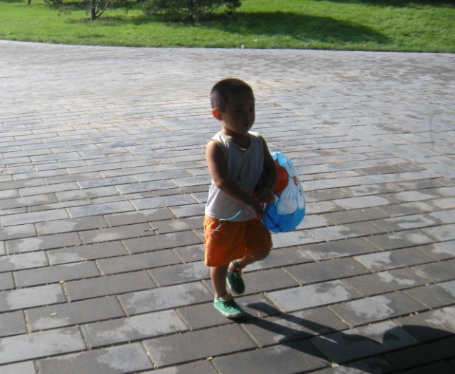 小家伙抱着气球在公园广场上跑来跑去 有时候还自己把气球往天上拍 它已经没什么氢气了,所以不会自己飞……