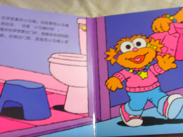 ======================================= 书中的第一个人物出场,他的名字是格罗弗,他是一只浑身蓝色的小怪物,可爱的格罗弗对小马桶产生了兴趣。 佐伊很喜欢小马桶。当她要用小马桶时她会说:“这是小马桶时间。”每次佐伊想要出门前,她都会告诉妈妈或爸爸,还会去小马桶上尿完尿。 ========================================= 第二个人物出场了,她就是可爱的佐伊。佐伊有一个粉红色的小马桶。通过这一篇可以告诉孩子在出门前应该先去“方便方便”。 大鸟对小马桶不怎么感兴趣。现在,他正忙着堆积木呢。 不过大鸟想要用小马桶时,他一定会告诉奶奶。你想要用小马桶时会告诉谁呢? ======================================== 第三个人物大鸟也出场了,这是一只通体黄色的大鸟,他长着可爱的大眼睛,我问谦谦:“大鸟在干吗呢?”“他在玩积木。”“嗯,现在他正在自己玩呢,可是他要是想上厕所了,他就会告诉奶奶,谦谦想尿嘘嘘的时候告诉谁呀?”“告诉妈妈。”哈哈。。现在小家伙已经知道自己尿尿了,每次憋尿的时候,都会跟我们说。 厄尼正在打小姑,他对小马桶也不怎么感兴趣。有时候厄尼想要尿尿时,会忘了用小马桶……好了,没关系,厄尼。 伯特想要尿尿时,一定会记得用小马桶。而且伯特用完小马桶后,还会记得洗手。伯特,你真是个好孩子。 ===================================== 第四个、第五个人物出场,他们分别是厄尼和伯特。这个厄尼第一次读的时候特别的拗口,为了让谦谦容易记住,我们就管他叫尼尼,呵呵。尼尼玩小鼓玩的太开心了,他都忘记去小马桶尿尿了,结果怎么样啊?“他就尿裤子了。”“嗯,对啦,如果不及时去厕所呢,就会尿裤子的,裤子都湿了,多难受啊。不过没关系,偶尔的一次忘记了,也没事。” “伯特可是个好孩子,他每次去厕所后都干什么呀?”“他洗手呢。”“对,你看伯特洗的多干净啊。谦谦平时都是怎么洗手的啊?”小家伙把双手拿起来做洗手的样子给我看,呵呵。以后每次从外面玩回来或者去过厕所后,我都用伯特来提醒他,一跨他说比伯特洗的都干净,他就乖乖地去洗手间了,呵呵。 格罗弗刚刚用完了小马桶,这可是他第一次用小马桶哦!他非常兴奋,他为自己感到骄傲! 加油,格罗弗!再见,小马桶! ================================== 格罗弗用完了小马桶,嗯,也没有想象中那么恐怖嘛!!! 说起恐怖,哈哈,不得不提一下,谦谦前些时对马桶特别抵触,因为有一次跟我去学校的时候,谦谦中午不睡觉,韩妈妈就给他讲马桶的故事,说不听话不乖的小孩子,马桶就会把他冲走的,哗啦啦,得,找不到妈妈了。谦谦听到这安安静静的,哈哈,因为他怕马桶把他冲走了。
