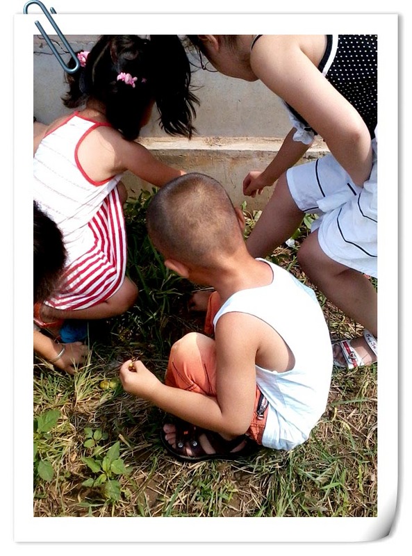 哈哈,看谦谦的动作,小家伙有新发现了 原来是凉亭下面有群小朋友在找散落在草地上的打枪用的子弹呢......