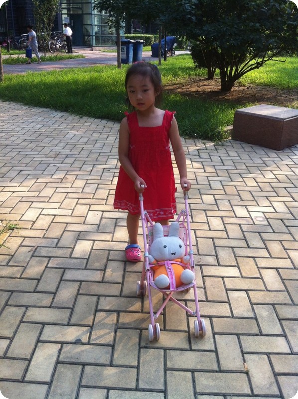 以前看电视,经常看到小女孩出去总带着个毛绒玩具,睡觉也是搂着娃娃睡,我总感觉特别假,至于嘛。可是现在,我信了,那是真的,俺家小妞儿不折不扣是我看到的剧中小女孩的翻版,喜欢抱着娃娃睡,出门喜欢带着,前几天下楼玩还推着玩具推车里面坐着她的米菲兔子,让我可觉得可笑又可爱呀。