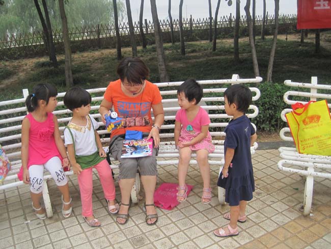 先上合影 ![]() 8月18日,秋高气爽,这期的读书会活动定在洛浦公园秋风园举行。因天气预报一直报的这天有雨,所以报名的人不多。其实我也有顾虑,已经做好了活动延期的准备。结果这天不但没下雨,反而天气还不错。 我们一行大小五人(我报的两大两小,实际去了三大两小),一早就准备好了,准时到达洛浦秋风园,还没有人来,我们放下东西休息一下(我拉着大包的漂流书)。小帅接着到了,帅妈还给我准备了神秘道具。然后思睿和暄暄也陆续到了,小帅拿了本漂流书要帅妈讲,于是帅妈给几个小朋友讲起了《孤独的小树》,算本次读书会的热身活动。 ![]() 帅妈讲完故事然后我们先做游戏《开火车》,小盆友还是很开心这个游戏的。看玩的多热闹。 ![]() 过了一会儿,玖久和果果也来了,读书会正式开始,我学着轰隆隆的声音,从背后拿出帅妈帮我准备的神秘道具——托马斯小火车,孩子们“哇——”一声欢叫进入今天的故事《不好,帽子飞走了》 ![]() 讲完故事,引导孩子们回答问题,几个孩子能明白是风把帽子吹走了这种生活现象,还知道风是怎么来的。 ![]() 第二个故事是《总共是100》,孩子们跟着一起数蚂蚁,看是不是都很认真哪? ![]() 故事讲完了,开始今天的手工——做风车,我拿出手工折纸分给大家,说了一下做法,大家都开始做了起来 ![]() 我记得小时候还有一种风车的做法,可是绕了半天也没绕过那个劲儿来,原来思睿妈是熟练工,立刻接过我的折纸做了起来,一会儿就做出了这个漂亮的风车 孩子高兴的玩着自己做的风车