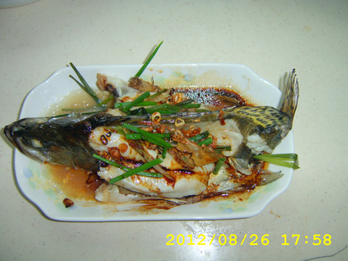 买回来的时候我就先清洗了一下,然后从鱼背上切了两刀,用盐巴把整条鱼抹了一遍,这样蒸了比较入味,到了晚上要蒸的时候还切了一些青葱及生姜放在鱼的身上及肚子里,这样比较去腥味。就开火烧水了,待到水烧开后再把整盘鱼放进锅里面蒸,象这么大的鱼一般蒸的时间要13分钟左右,锅里的水最好加够,中途尽量不要打开锅盖。熟了再打开。时间快到的时候取另上一个锅热锅下油再加点葱头下去爆香,再把整盘鱼取出来,把葱取出再放入新的葱。加入适量的酱油,再把锅里的热油撒在鱼身上即可。再炒上一盘青菜,吃了两小碗的稀饭。