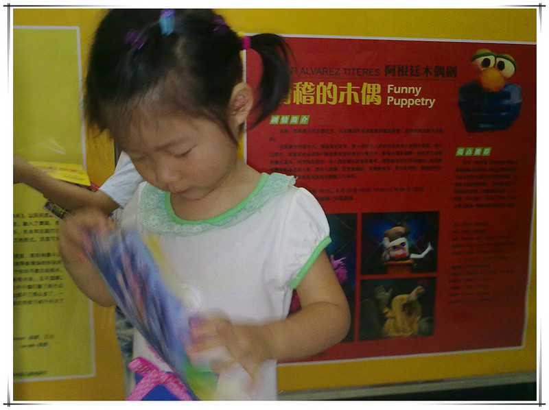 上周六,妈妈带敬仪去儿艺看木偶剧了,来自于阿根廷的木偶剧团表演的。说是木偶剧团,其实剧团老板、导演、主演都是一个人哈,一个中年男人,非常卖力的一个人在台上表演。偶尔还冒出几个不带些想象根本就听不懂的中文,比如:木偶、魔术。貌似连舞台的灯光都是他一个人在控制,什么道具呀啥的都是提前准备好的,顺手就从旁边的箱子里拿出来了。貌似这个木偶剧团只有他一个人就足够了!!